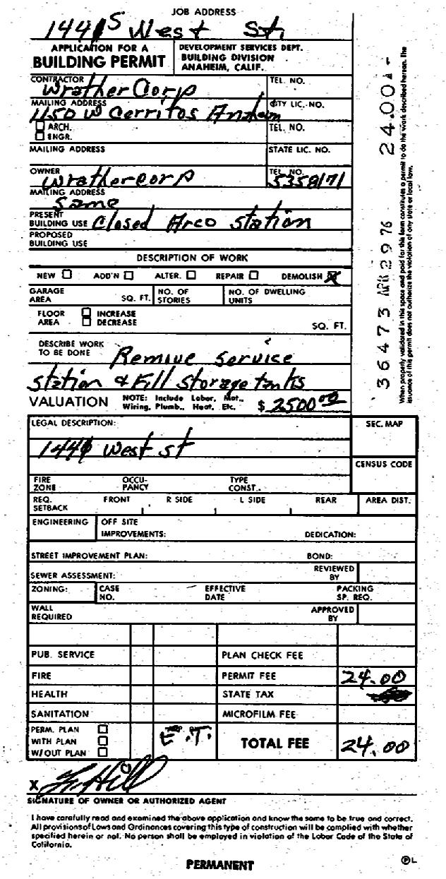 Donald Ballard of MagicalHotel.com, author of the book Disneyland Hotel: The Early Years sent us this image of the actual demolition order for the Richfield Station in 1976. The order notes "fill storage tanks." At that time they were typically cut off and filled with dirt.