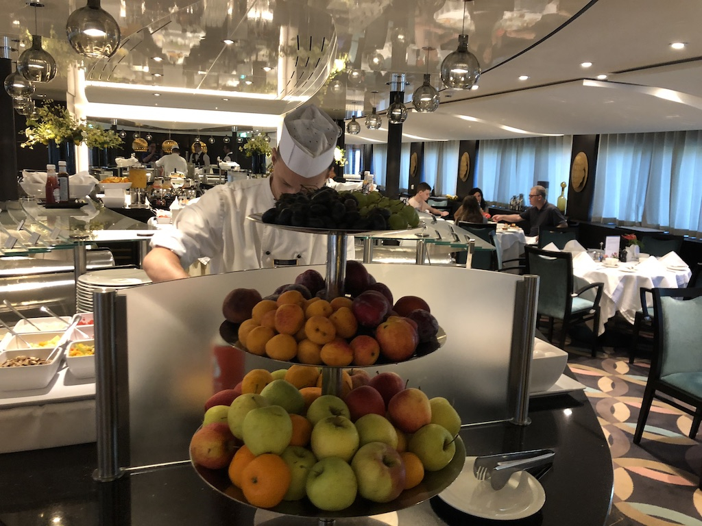 Before we explored Budapest, we had some options for breakfast. There was an Early Risers pastry option in the lounge from 6 to 7. Starting at 7 and running until 9 was the main breakfast in the dining room. There was also a Late Risers pastry option from 9 to 10. We did the main breakfast in the dining room which was a buffet with a selection of server ordered options. The special of the day was chocolate chip Mickey shaped pancakes. The food and service were both excellent. We then were scheduled to meet our Adventure Guides in the lounge at 8:50 for our daily briefing. As we passed by the reception desk, we were given a color-coded card that would be our group. You had the option to bypass the first activity or bypass the whole planned day to do your own thing, but we decided to do what Disney planned for us. Our color-coded card matched one of the guides' shirts and their paddle of power, so as we entered the briefing, we knew we would be with Joshua from Vienna today.