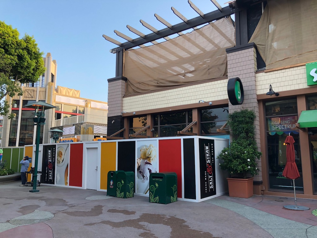 The former Haagen-Dazs and Wetzel’s Pretzels are behind construction walls