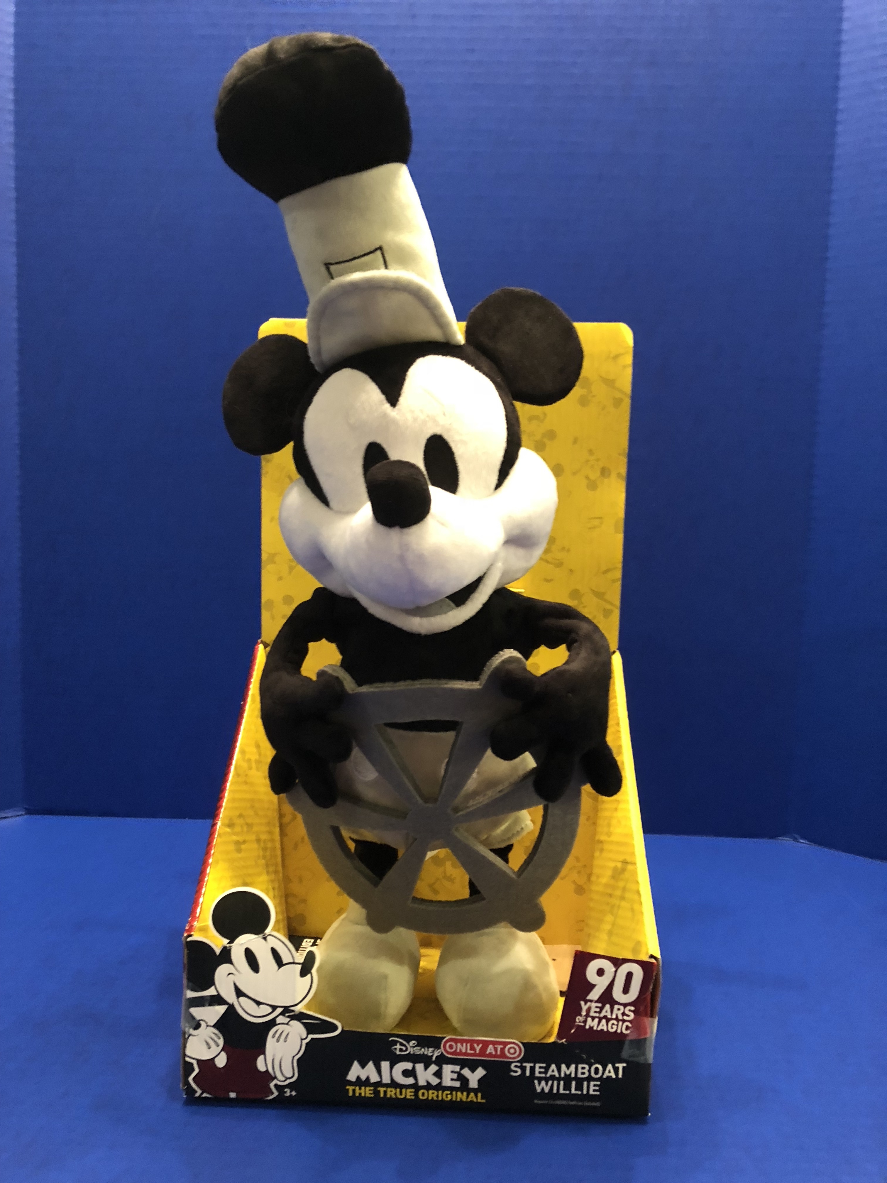 My favorite piece on display is a Target exclusive, so you won't find this one anywhere else. It's an animated Steamboat Willie plush, like the kind Hallmark stores are famous for. Pressing Mickey's left hand causes him to bounce up and down and side to side while shaking his wheel to the tune of "Turkey in the Straw" from his original short. To see him in motion, watch the video below.Just Play also has a collectible line of mini plushes that celebrate Mickey's most iconic moments, including a box set with all of them, and larger plushes. It's so fun finding all of the Mickey Mouse 90th Anniversary merchandise that's popping up everywhere. Of these pieces, I highly recommend the animated Steamboat Willie plush, a great way to celebrate Mickey's origin during his 90th celebration.