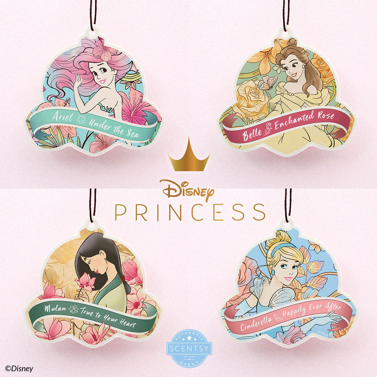 Each of the four Disney Princess scents are also available as Scent Circles for $3.25 each. They feature original artwork on both sides. CInderella's, for example, has the coach on the backside and the shape of these pieces is similar to it.