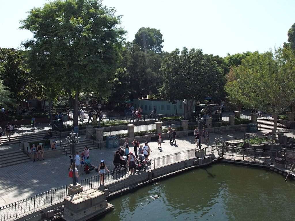 Over at Disneyland Main Street is being decorated for HalloweenTime, despite some major refurbishments. Down at the central hub, sections of the waterways have been closed off for work. Most people do not realize that the Disneyland “dark water” system is all connected. The entrance point is among rockwork in the former motorboat lagoon. From there the water travels under walkways to the moat at Sleeping Beauty Castle. It then flows around the west side of the central hub, past the entrances to Frontierland and Adventureland. After moving around the perimeter of the Enchanted Tiki Room it flows into the Jungle Cruise. This is connected underground to the Rivers of America. The water in the river moves slowly to a low point in the northwest corner, where a pump station lifts it to a gravity fed pipe back to the rockwork where the cycle begins again. While work is being done on different sections, the pump has been turned off.