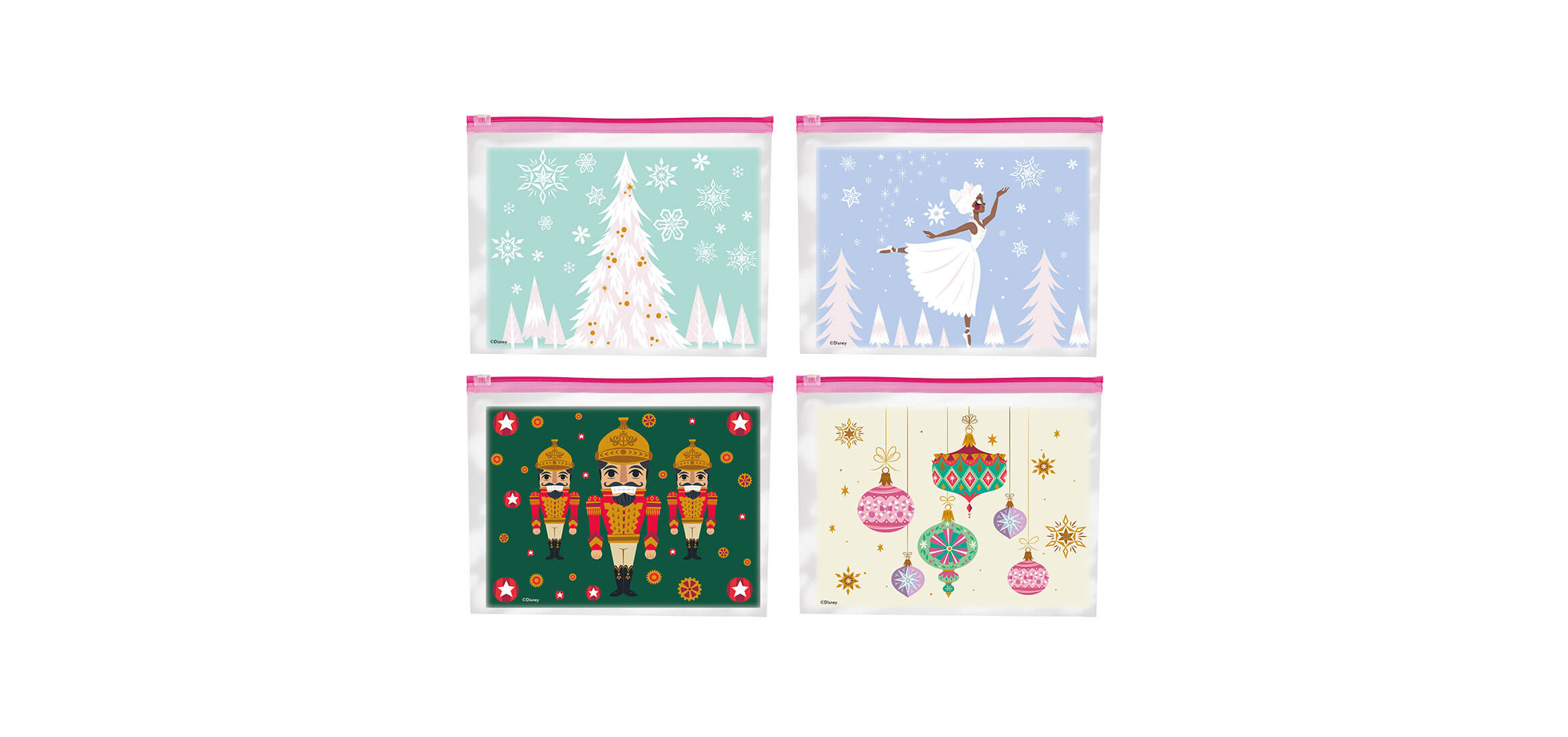 The bags and containers feature festive nutcrackers, Christmas trees, and ornate ornaments.