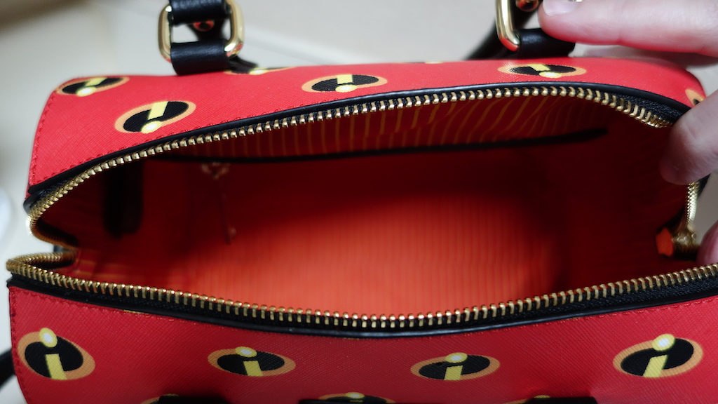 As I said before, the outside of the bag is a bold red background with small Incredibles logos. The logos are the perfect size — not too big, not too small but easy enough to recognize. In fact, everywhere I've taken it, someone has asked, "Is that an Incredibles purse?!" to which I respond, "Yes! It's by Loungefly and you can get it on Fun.com!" Everyone who's stopped me has thought it was cool. And it is; it's just that the design is little louder than I'm used to and it's a tad bit too large for me.