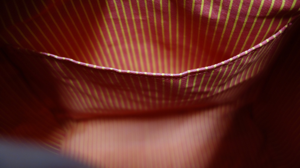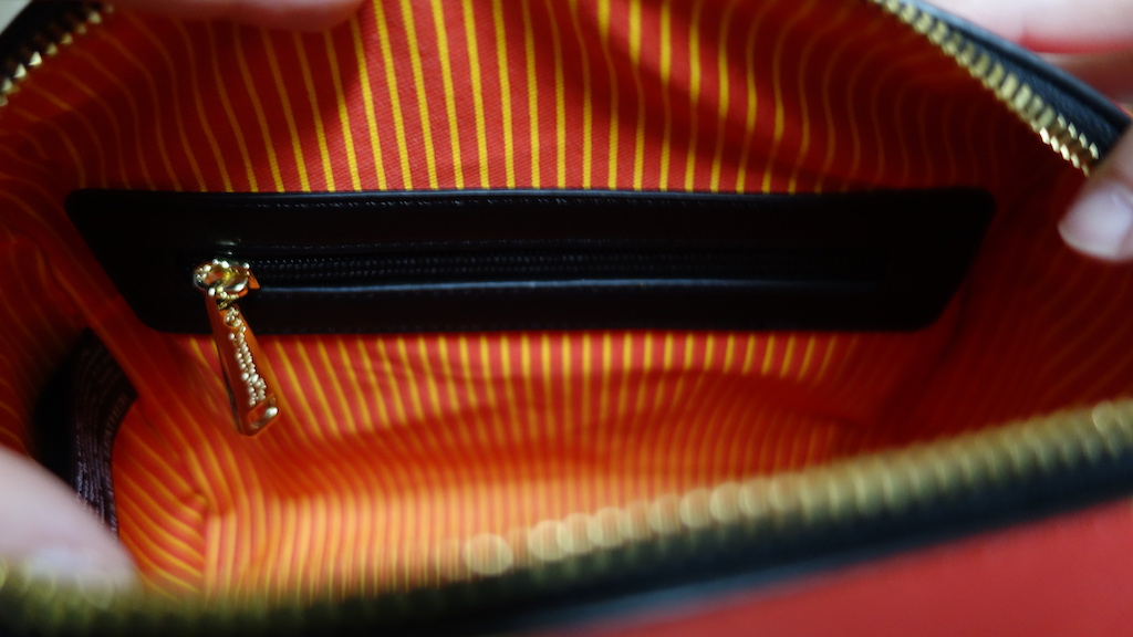 The bag is designed well and felt very sturdy. It comes with an adjustable strap so it can be worn on your shoulder, or across your body. I used it both way and prefer the crossbody style. It's excellent quality and I noticed no construction defects. The zippers worked well, the handles were solid, and the strap was secure and sturdy. After checking everything out, I noticed a black mark about the thickness of pencil tip on the very front. I tried to remove it, but could not. Fortunately it's small and didn't smudge.