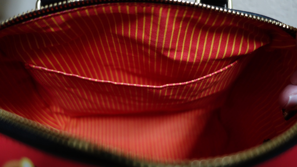 As I said before, the outside of the bag is a bold red background with small Incredibles logos. The logos are the perfect size — not too big, not too small but easy enough to recognize. In fact, everywhere I've taken it, someone has asked, "Is that an Incredibles purse?!" to which I respond, "Yes! It's by Loungefly and you can get it on Fun.com!" Everyone who's stopped me has thought it was cool. And it is; it's just that the design is little louder than I'm used to and it's a tad bit too large for me.
