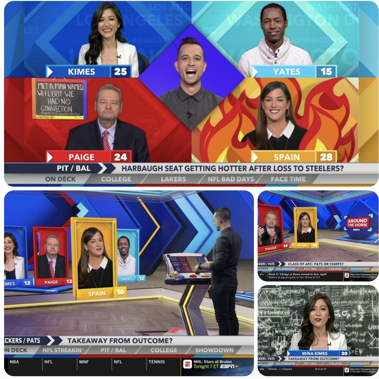 Deftly helmed by its long-time host Tony Reali, Around the Horn now takes advantage of new technologies to seemingly bringing the various talking heads into the space with Reali or add more a dynamic background to the journalist as they share their insights. During the premiere edition, viewers saw flames erupt as Sarah Spain offered a hot take and the background behind Mina Kimes fill with equations as she backed up her take with a variety of metrics.