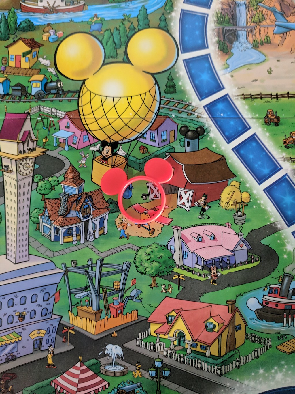 In this board game, you look for hidden objects before the time runs out. Among the many regions to search is ToonTown with Mickey’s house, Radiator Springs, and the Hundred Acre wood. You use the Mickey shaped piece to mark the object when you find it.