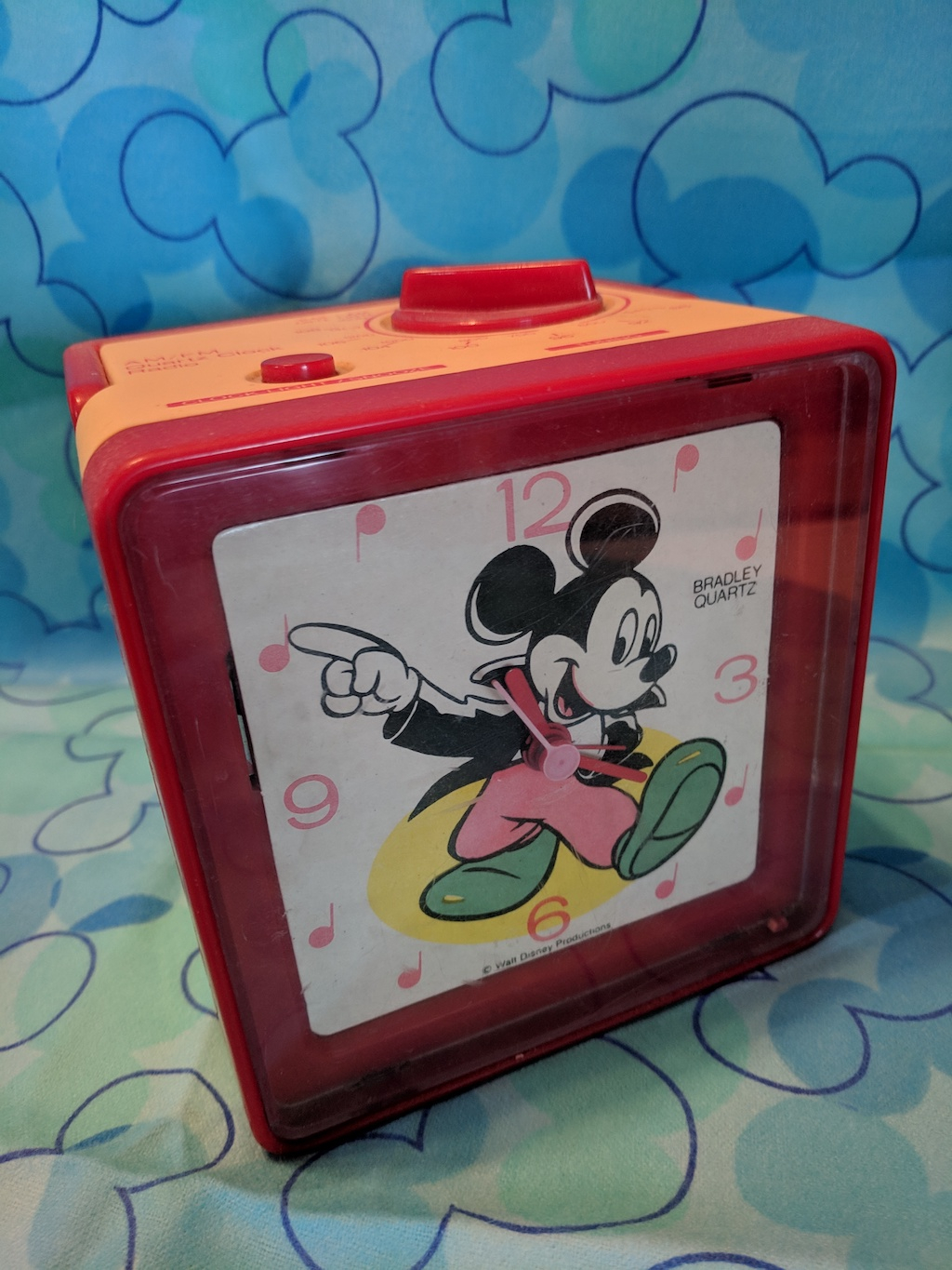 Simple battery operated AM/FM Mickey alarm clock. It went off to college with me. Pretty sure I purchased it 30 years ago.