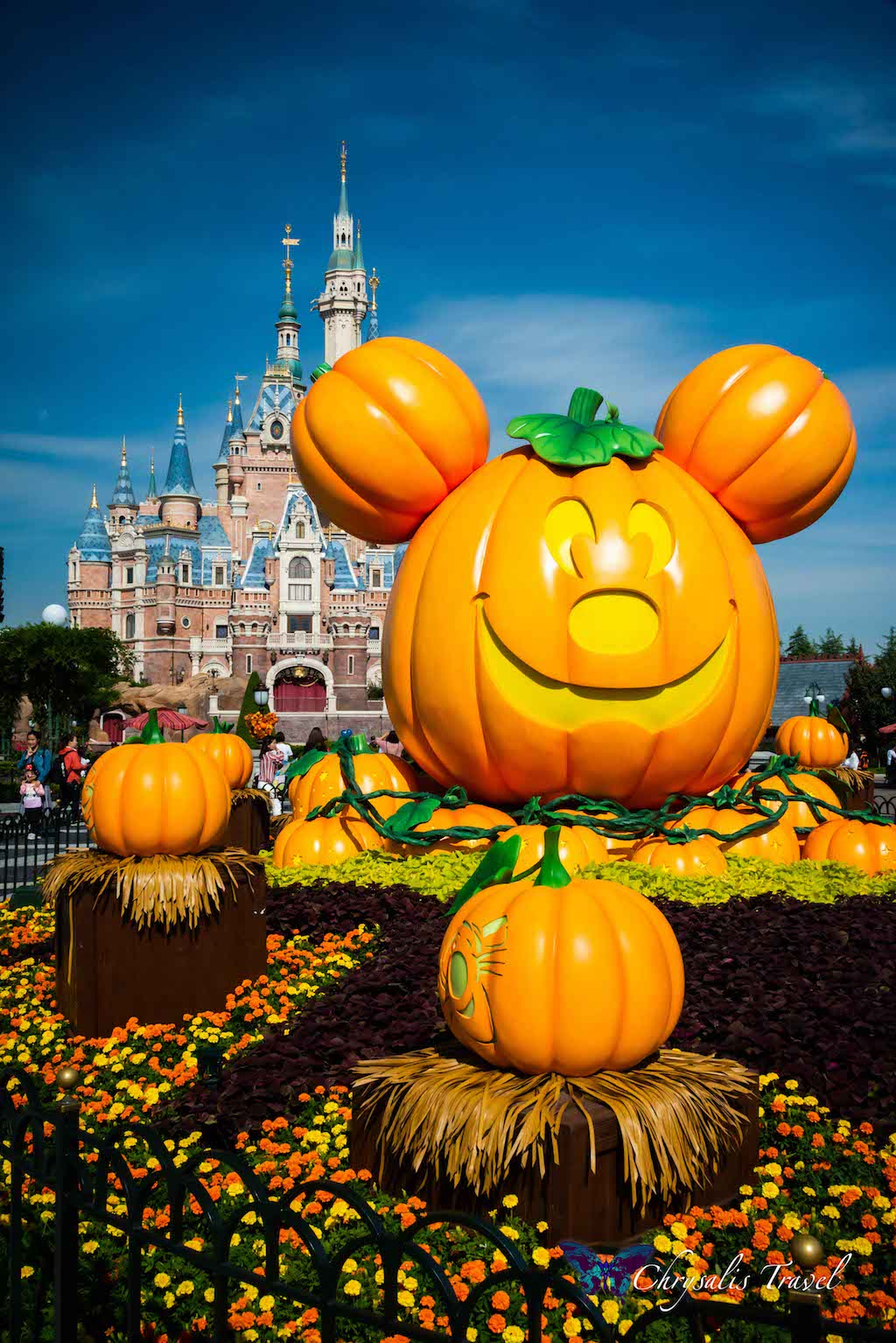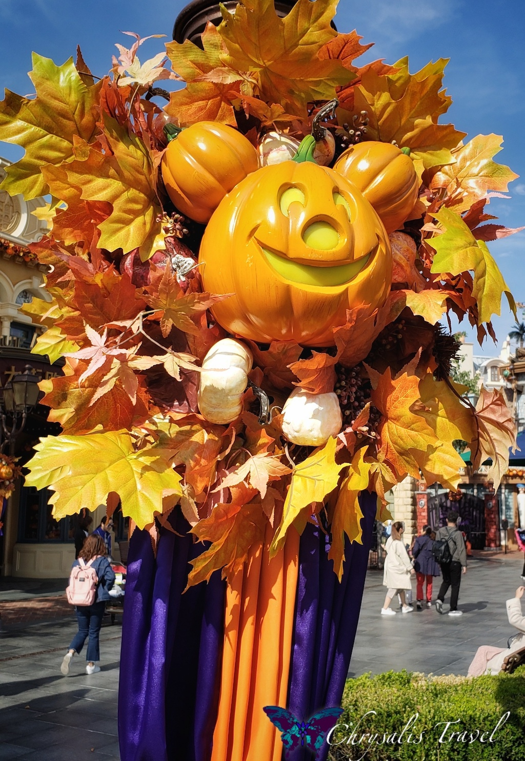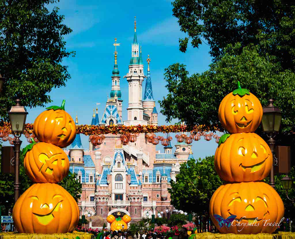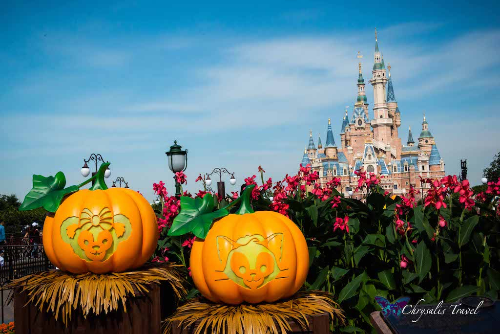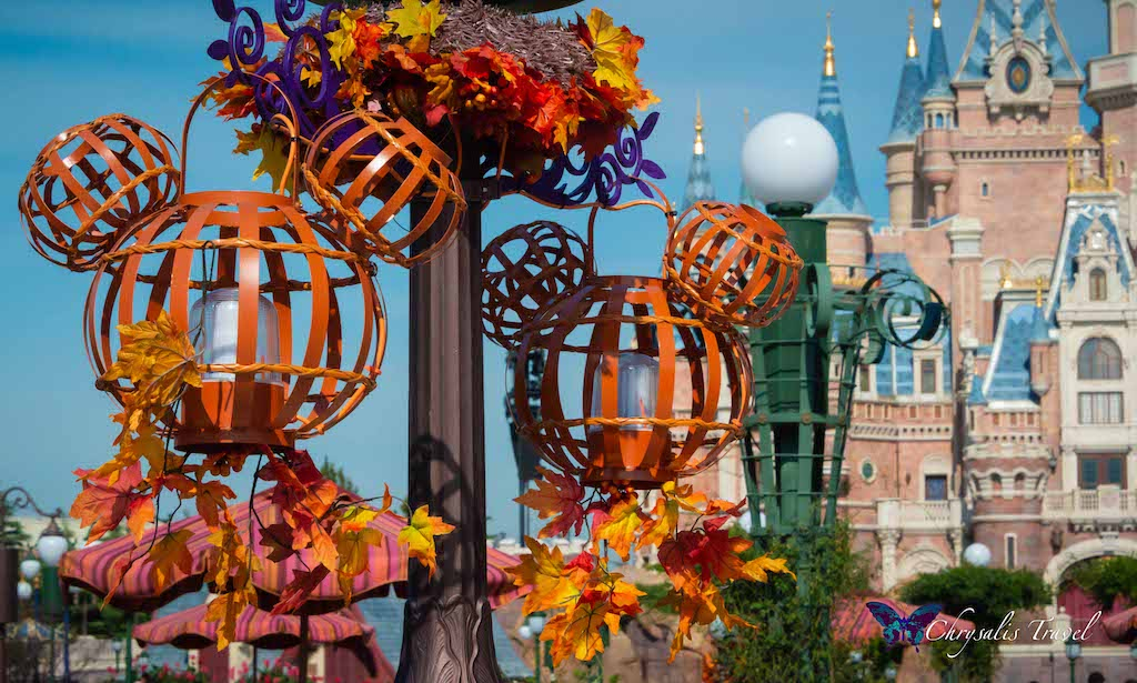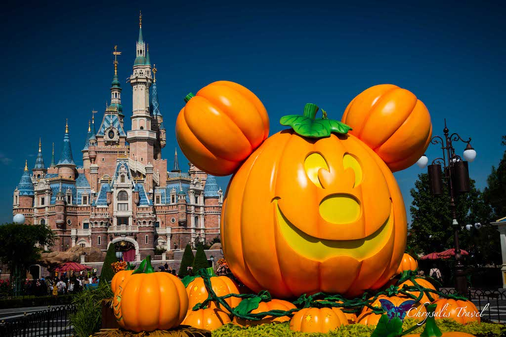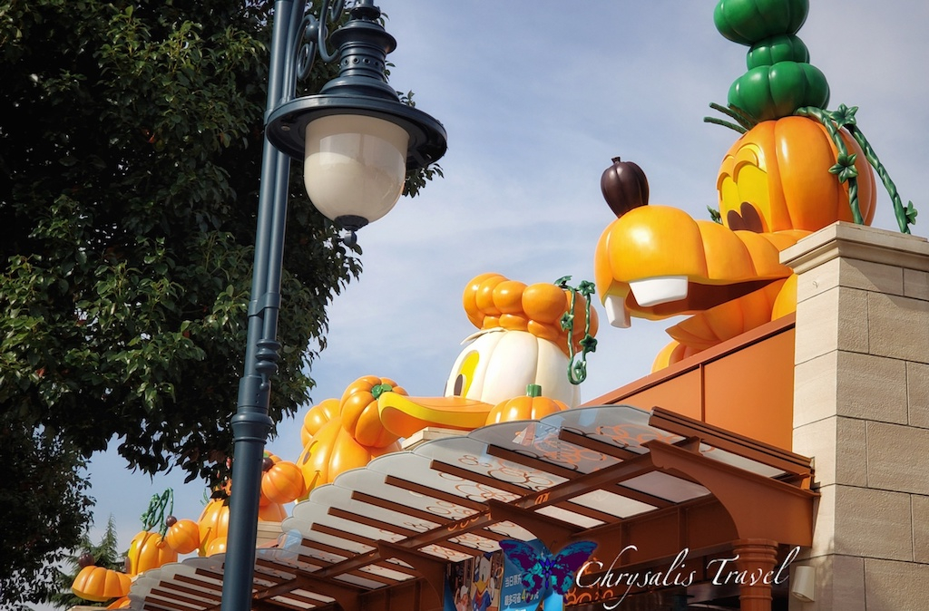 Walking under the ‘train station,’ you enter Mickey Avenue (instead of Main Street U.S.A.). Similar to the Magic Kingdom’s décor at Disney World, we saw stacks of pumpkins creating a great photo-op, with the enormous Enchanted Storybook Castle in the distance. Can you see the Mickey pumpkin down the street?Each Disney Park has unique lamp post decorations for Halloween. (We can attest to this, having seen five out of six Disney castles this October). This Mickey pumpkin is happy to represent Shanghai Disneyland.