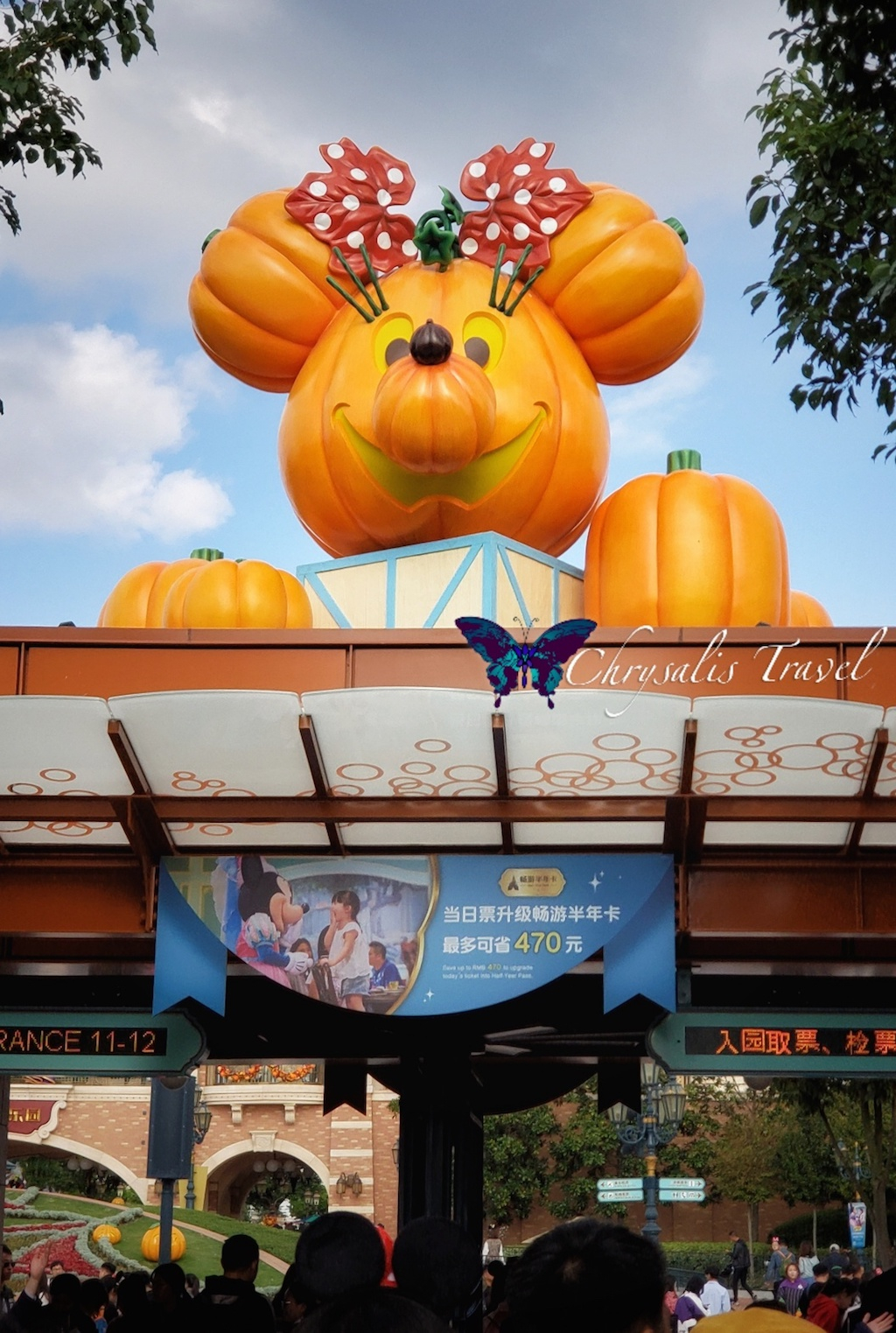 A cluster of pumpkin Disney characters were perched atop the entry gates. These were very similar to ones we’ve seen in our domestic Parks.We love Minnie’s polk-a-dots! The sign below her advertises upgrading a full-priced one-day pass to a half-year pass (annual passes don’t exist at SHDL).