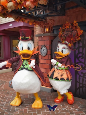 Who’s the leader of the club that’s made for you and me? Mickey and Minnie are dressed in coordinating bat-themed Halloween outfits on Mickey Avenue.Donald and Daisy say ‘boo!’ as they greet guests.