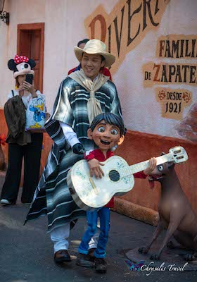 We saw an unadvertised pop-up show in Adventure Isle, themed to Coco. Miguel sang and walked in a beautifully-designed Día de los Muertos set.