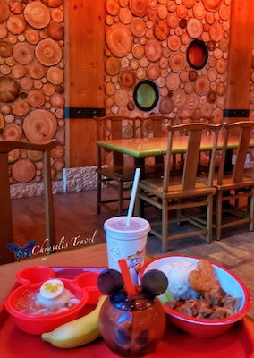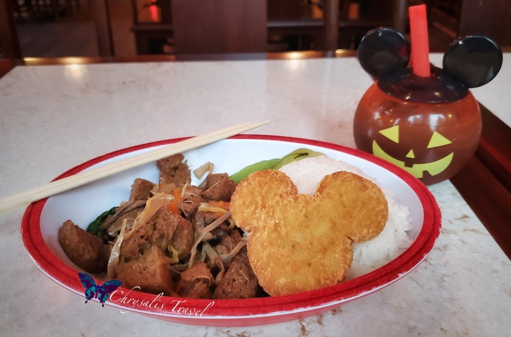 Traveler’s Tip: you get a small discount on the sipper cups when ordered with a meal (just pay the upcharge for the souvenir cup). Here is a smiling pumpkin Mickey sipper (with our vegetarian meal and Mickey hash brown) at the Wandering Moon restaurant. It came with a delicious red bean drink.