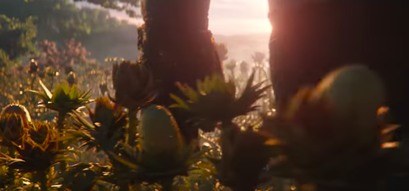 Next, we get a brief look at the Infinity Gauntlet, still on the left hand of Thanos as he walks through a field. We don't get a good look, so it's difficult to tell just how damaged the gauntlet is. This shot is accompanied by the beginning of a voiceover by Black Widow, in which she explains that "Thanos did exactly what he said he was going to do."