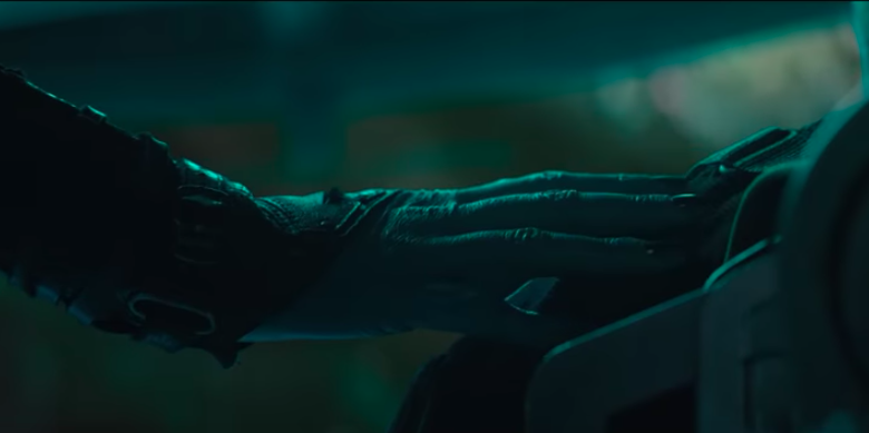 Next, we get a brief look at the Infinity Gauntlet, still on the left hand of Thanos as he walks through a field. We don't get a good look, so it's difficult to tell just how damaged the gauntlet is. This shot is accompanied by the beginning of a voiceover by Black Widow, in which she explains that "Thanos did exactly what he said he was going to do."