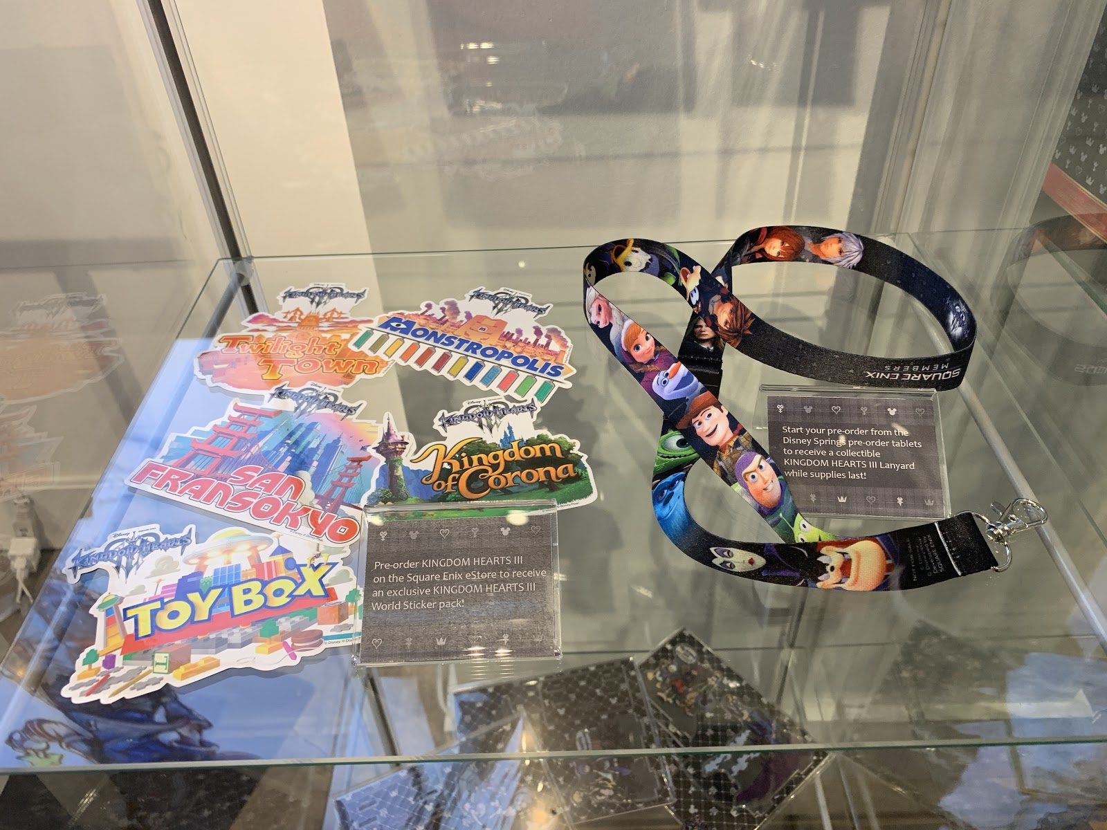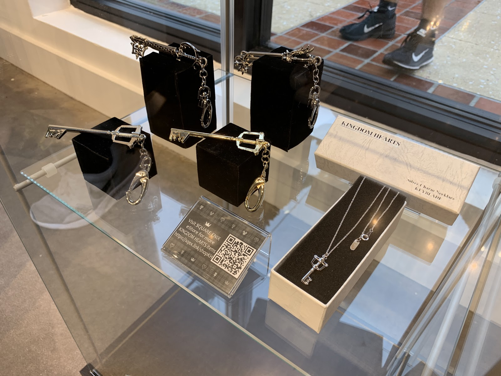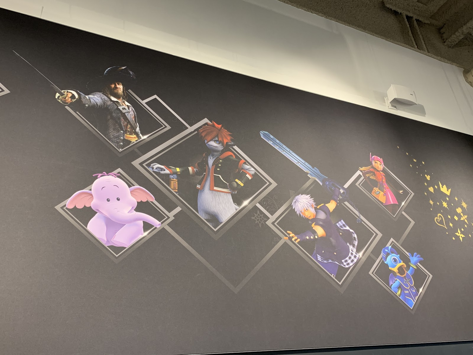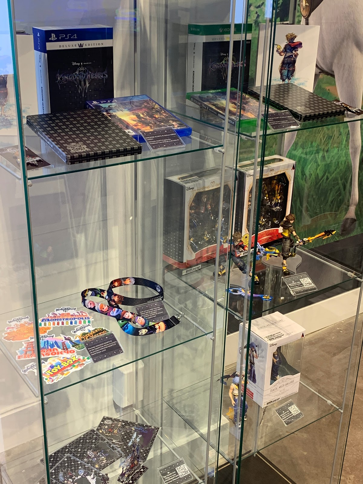 The walls of the shop are lined with artwork featuring some of the new adventures players will embark on when the game hits store shelves. Also on display are various merchandise items, fun Keyblade displays, and more.
