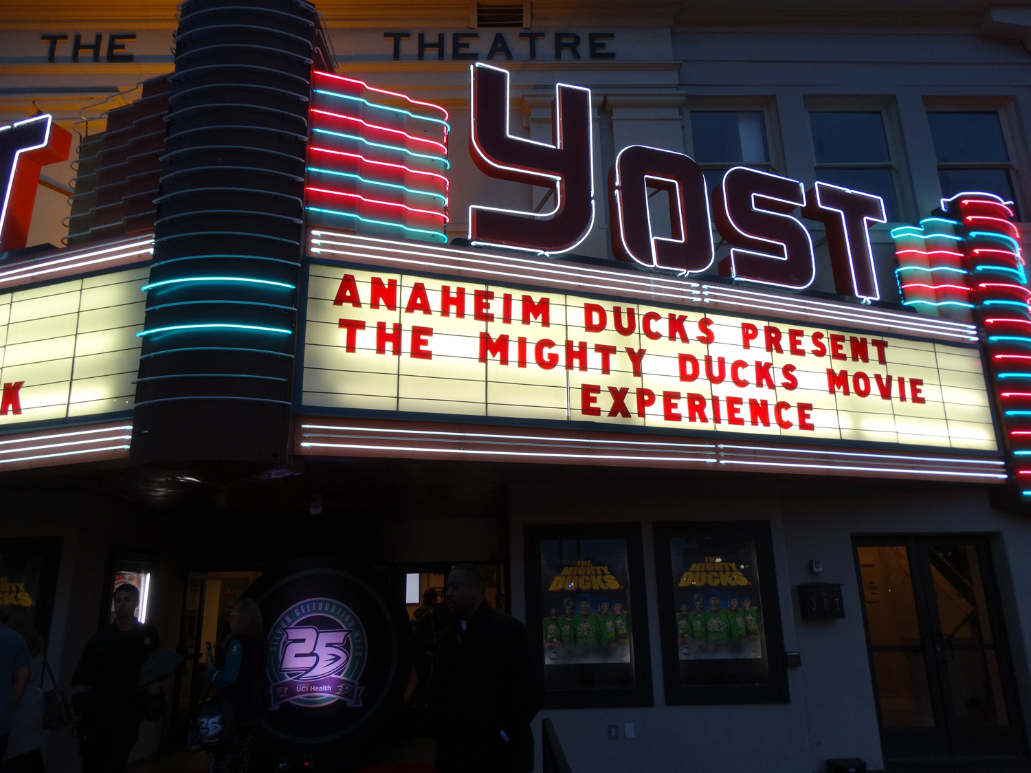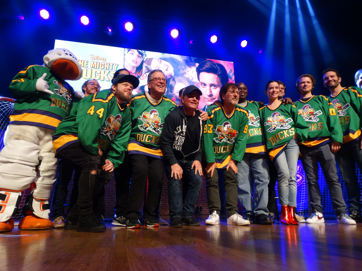 Quack, quack, quack, quack, quack! Anaheim Ducks 25th Anniversary Silver Celebration Week continued Tuesday evening with a screening of the hit live-action Disney movie that originally inspired the hockey team (not to mention two theatrical sequels and an animated TV series) back in the early 90s. The Mighty Ducks Movie Experience saw Southern California fans of the film gathering in Santa Ana’s Yost Theatre for a night of interactive activities, raffles, photo ops, and even some time with the cast of the movie themselves.
