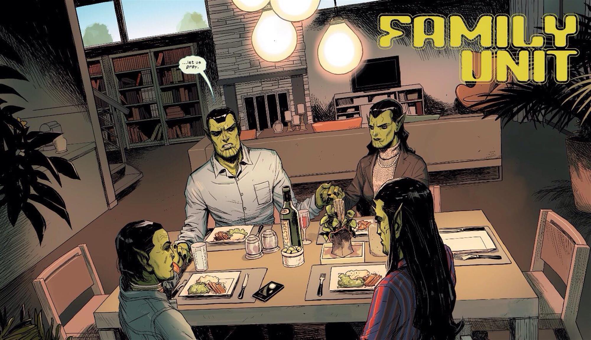 Meet The Skrulls follows a family of Skrulls disguised on Earth to carry out a mission to stop something called Project Blossom. Their mission, of course, is imperative to the Skrulls overall goal of taking over the planet, once again making them the bad guys. However, with the story being told from their point of view, we see the family as any other ordinary human family, minus the green skin and objective to stop an intergalactic defense project.