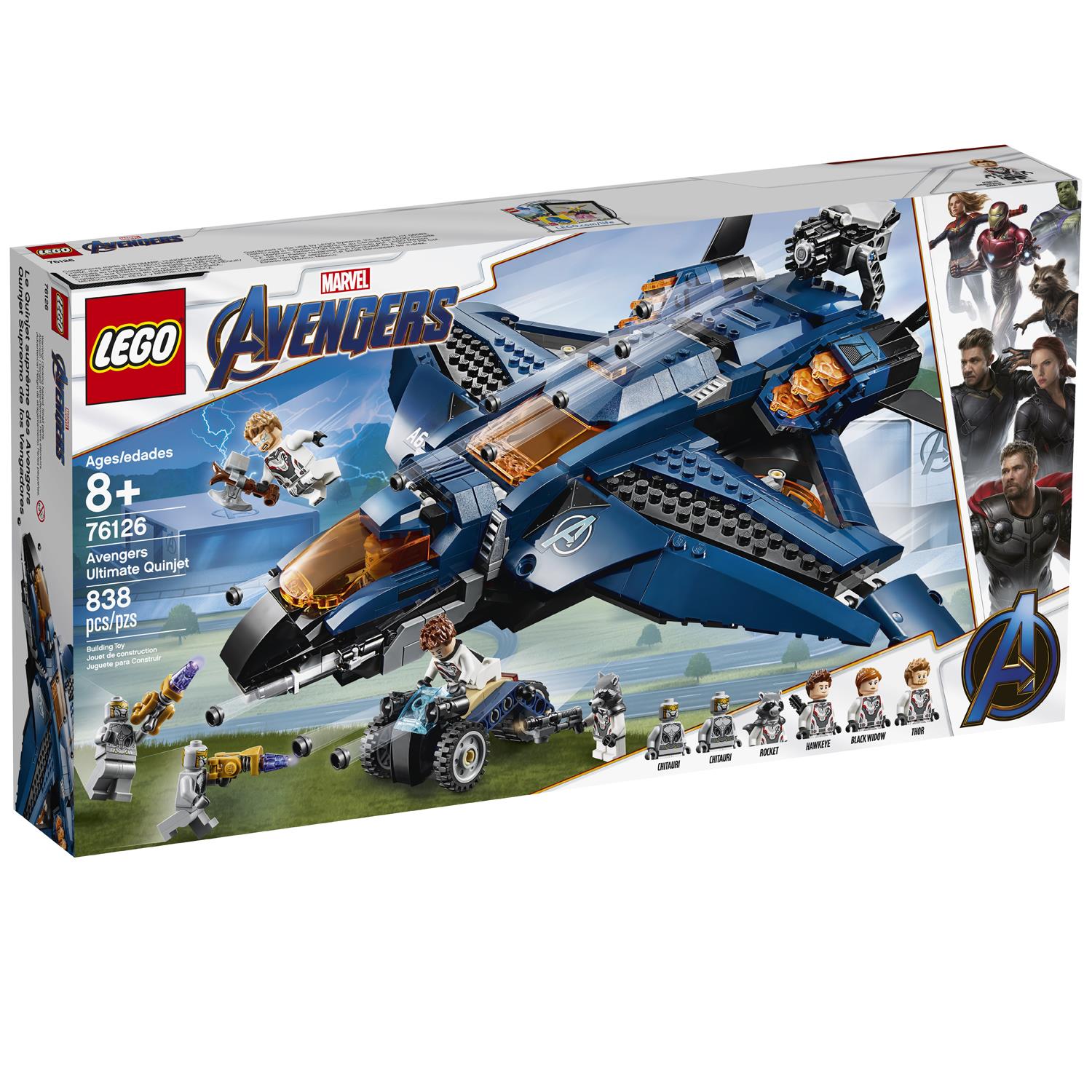 - The Marvel Ultimate Quinjet model features an opening minifigure cockpit, 2 stud shooters, opening passenger compartment with 2 minifigure seats and weapon racks, opening rear compartment with fold-out 6-stud rapid shooter and trike, adjustable wings and spinning rotors. • Trike features a minifigure seat and 2 stud shooters.