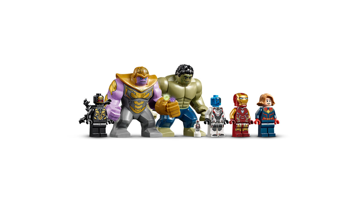 - This buildable superhero playset includes 4 Marvel Universe minifigures: Iron Man, Captain Marvel, Nebula and a 4-armed Outrider, plus posable Hulk and Thanos big figures and an Ant-Man microfigure.