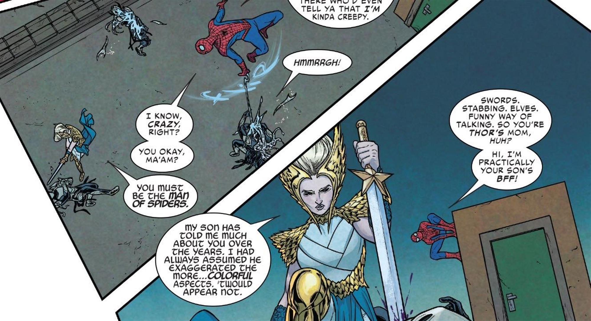 While Thor and Loki are at the center of this story, it’s Spider-Man that steals the show in this particular issue. Lady Freyja, the mother of Thor, is attacked by Malekith’s dark elves and the web head swings to the rescue. As per usual, his banter is worth a few laughs.