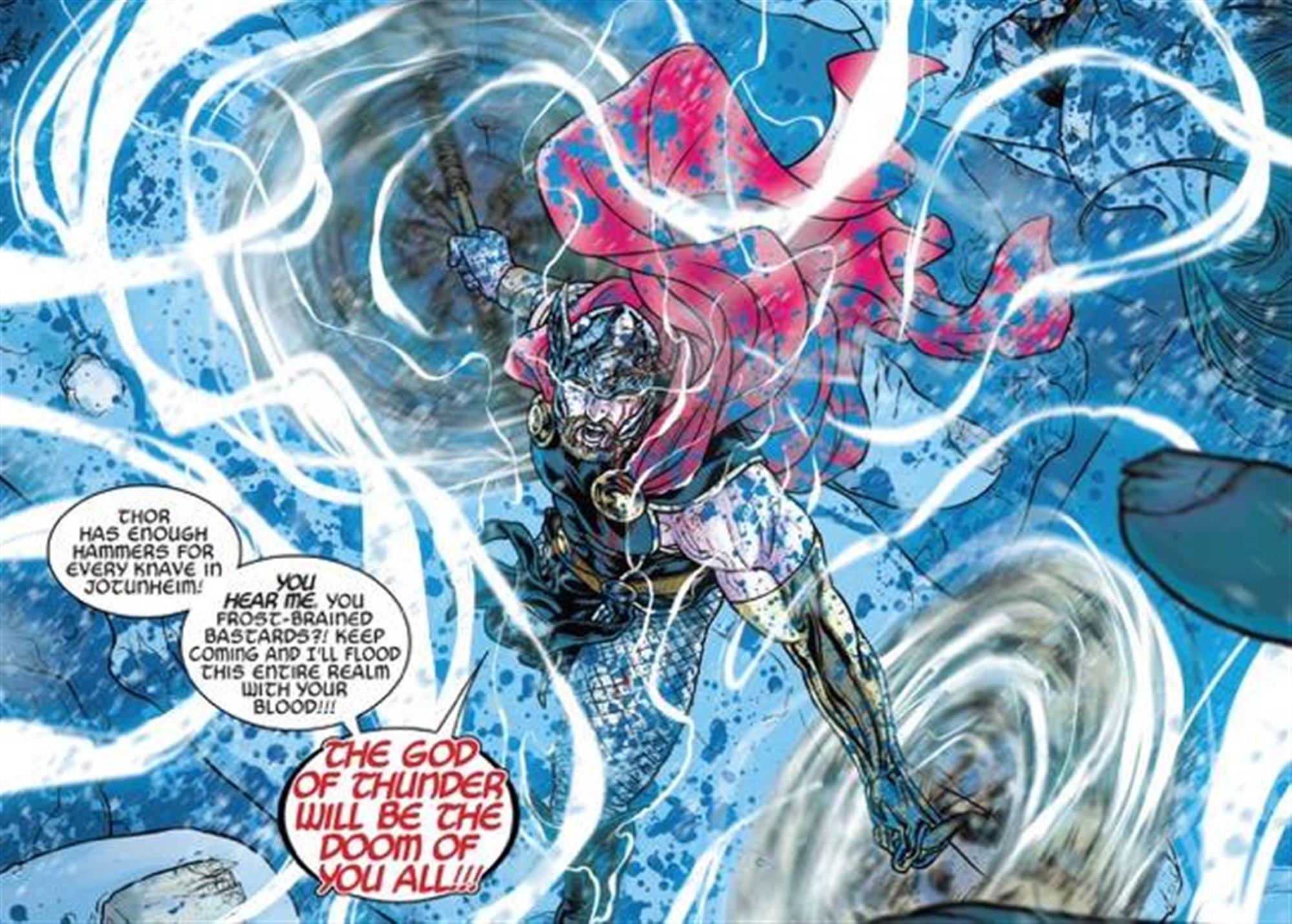 The story wastes no time getting into the action. After a brief explanation of the ten realms, we immediately get a fight on asgard, followed by Thor getting an unexpected visitor. A few pages later we’re right in the thick of a huge fight with Earth’s mightiest heroes.