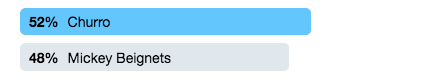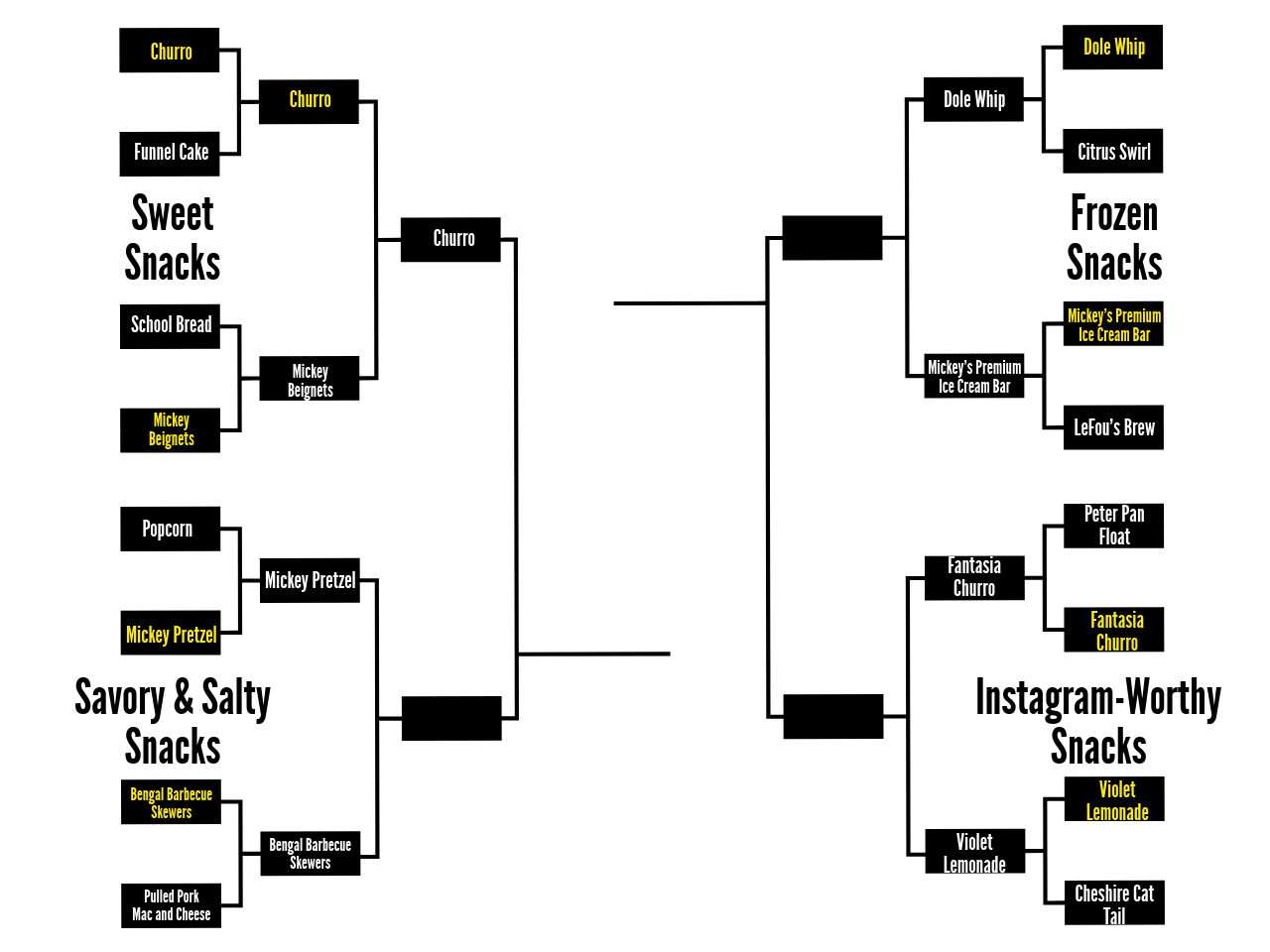 Before we move on to today’s matchup, let’s take a look at our last result. It was another close matchup, but the Churro just barely beat out Mickey Beignets to be named the best sweet Disney snack and move on to the final four of our tournament.