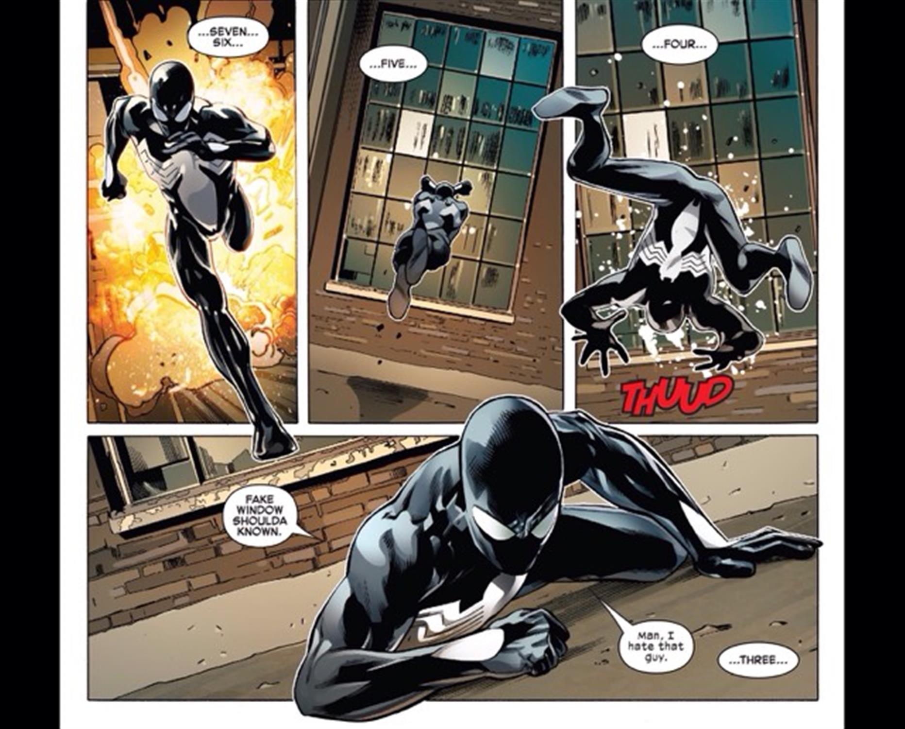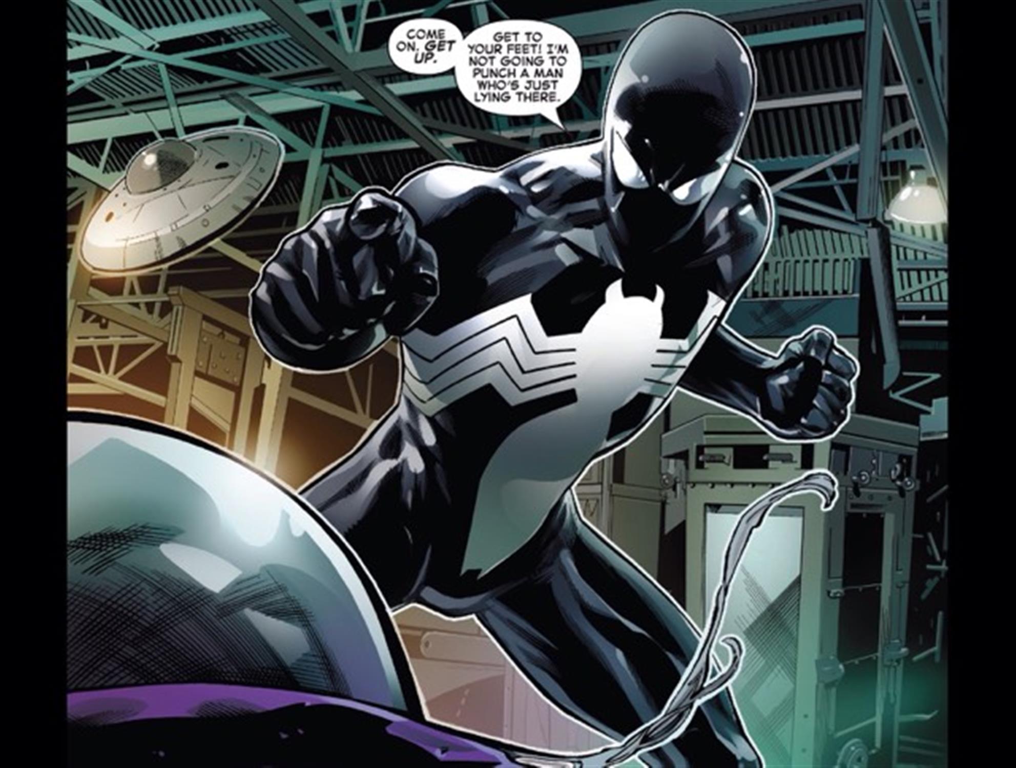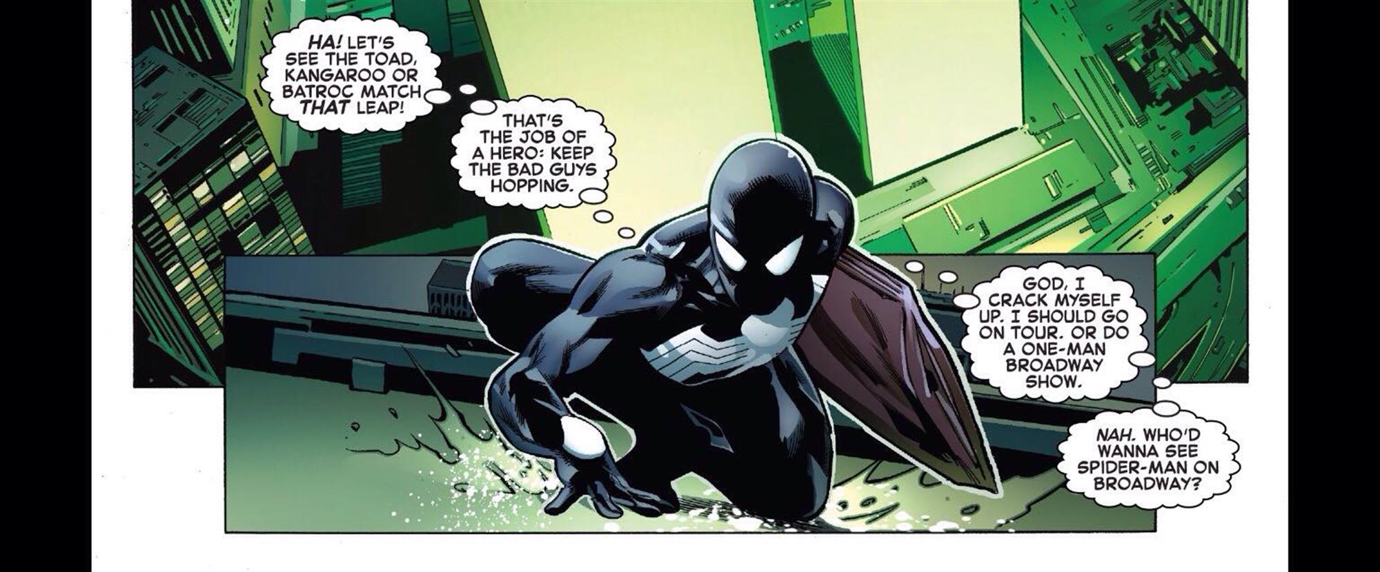 As is the case with any good Spider-Man comic, “Symbiote Spider-Man #1” features not just web-slinging action but also the nervous humor that Spidey is known for. For example, the wall-crawler throws a subtle mention at the Spider-Man Broadway musical.