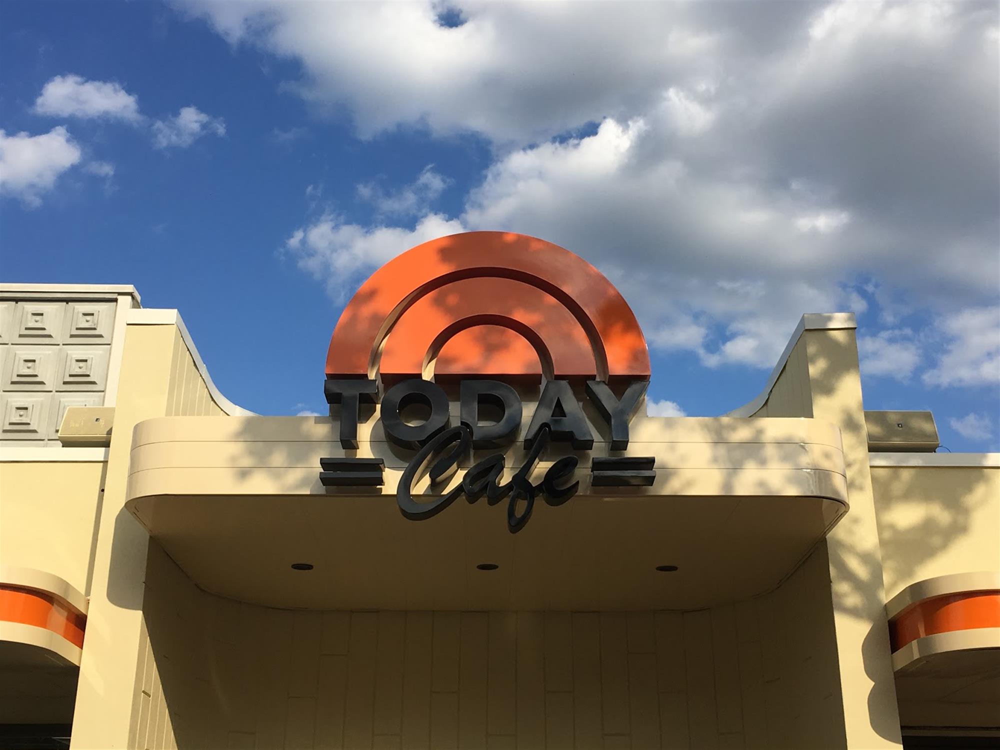The TODAY Cafe is located near the entrance of the park, in the space formerly occupied by the recently closed Beverly Hills Boulangerie. The outside of the building is fairly plain, with the TODAY Show logo over the entrance, welcoming guests on their way in. There is also a nice seating area at the front and side of the building.