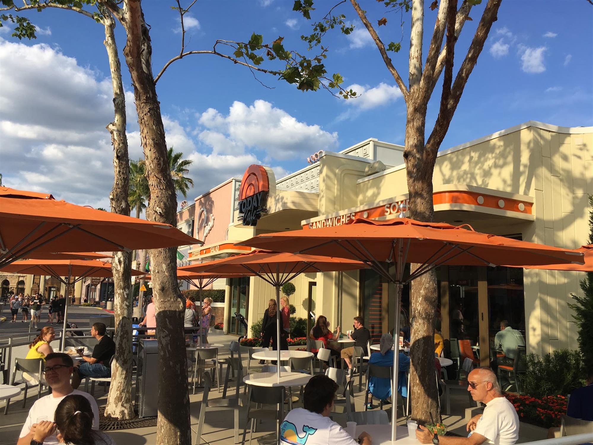 The TODAY Cafe is located near the entrance of the park, in the space formerly occupied by the recently closed Beverly Hills Boulangerie. The outside of the building is fairly plain, with the TODAY Show logo over the entrance, welcoming guests on their way in. There is also a nice seating area at the front and side of the building.