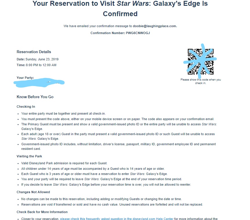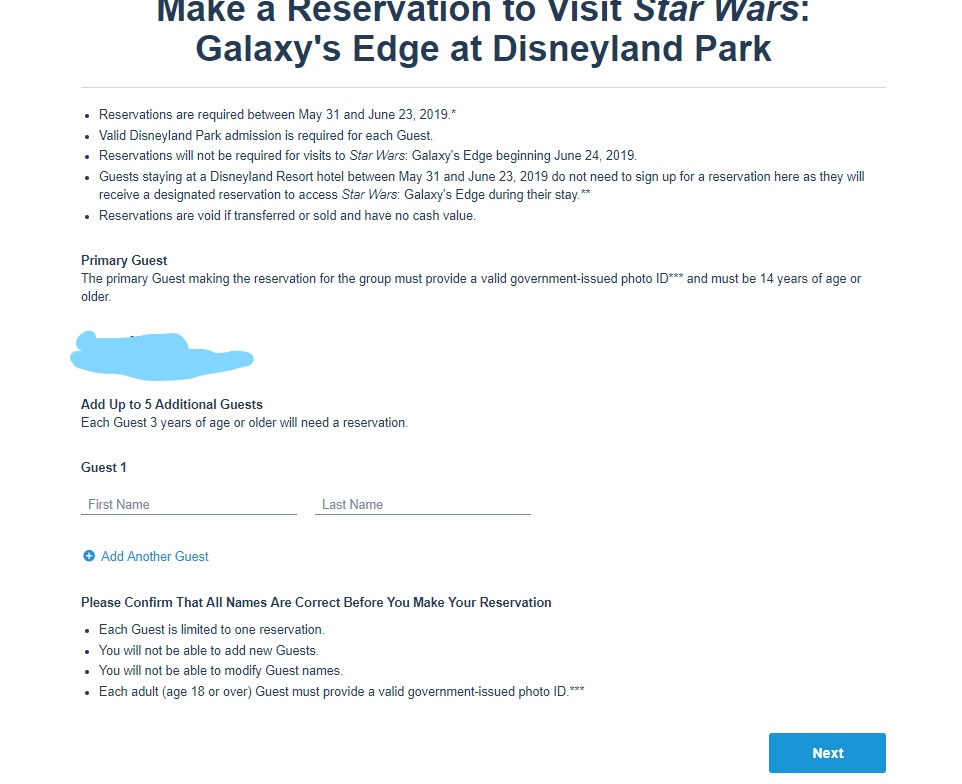 - You will need to be logged into your Disney Account and have the names of everyone who will be part of your Star Wars: Galaxy’s Edge reservation (up to six guests total per reservation).
