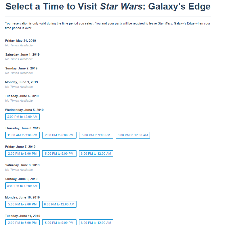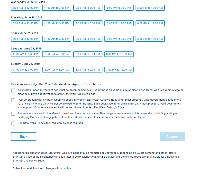 - Once you make your Star Wars: Galaxy’s Edge reservation, no changes or modifications will be allowed. Reservations are void if transferred or sold. Unused reservations will be forfeited and not replaced.