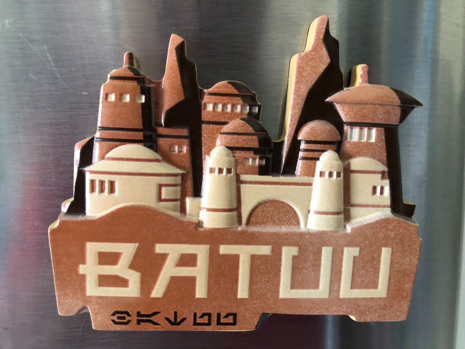 As of yesterday, guests were unable to purchase individual Kyber Crystals at Dok-Ondar’s (though Holocrons and buildable lightsabers at Savi’s Workshop still came with them), many of the legacy lightsabers, the Sabacc deck at Toydarian Toymaker, personality chips and carrying backpacks at Droid Depot, the Rancor Teeth beer flight ceramic serving tray at Oga’s Cantina, the highly sought-after Batuuan Spira gift card, and my favorite Batuu refrigerator magnet at The Jewels of Bith, among other items due to lack of supply.