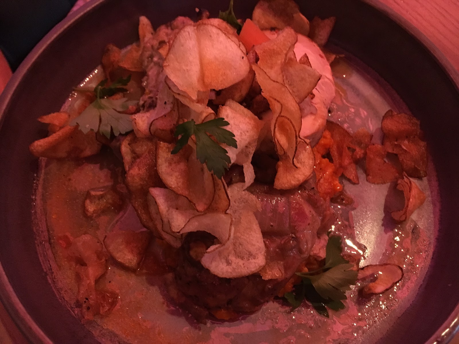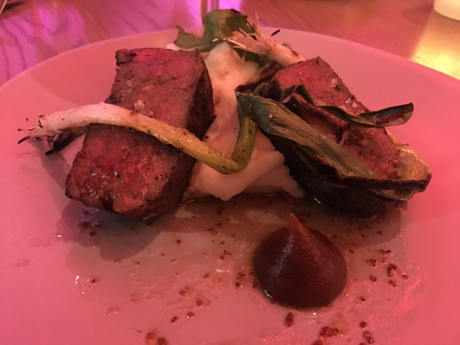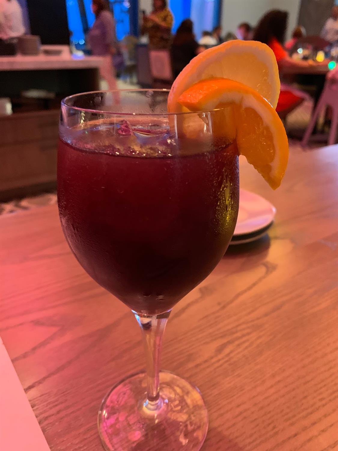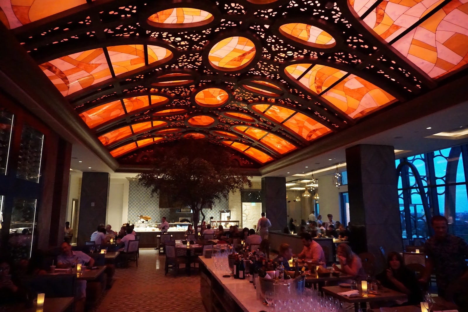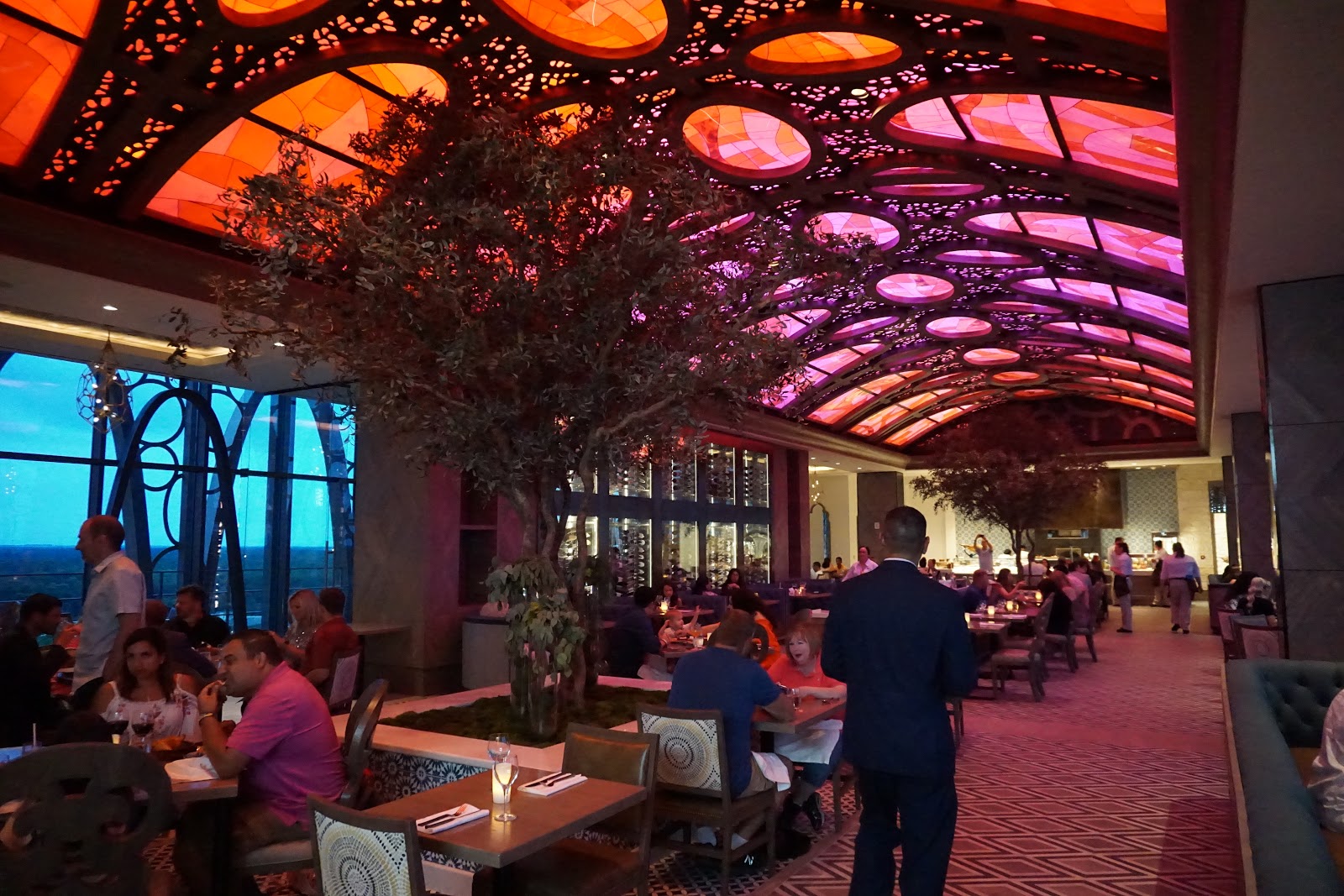 The dining area consists of one large open room with a colorful light fixture spanning the majority of the ceiling. While this colorful lighting wasn’t great for pictures (I apologize in advance for the photos), it did make for a nice ambiance.