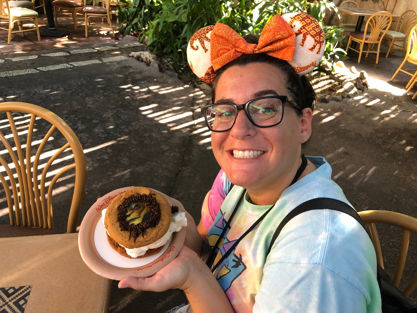 Next, we tried one of the new snacks offered in the park inspired by the Lion King. There are several new options including a Simba Cupcake, the Bugs ‘n Grub Waffle Cone and more. We tried the Simba Ice Cream Sandwich and it was absolutely delicious. It’s a simple snack - just vanilla ice cream sandwiched between two chocolate chip cookies - but it’s delicious. It’s also a massive snack that almost has to be shared.