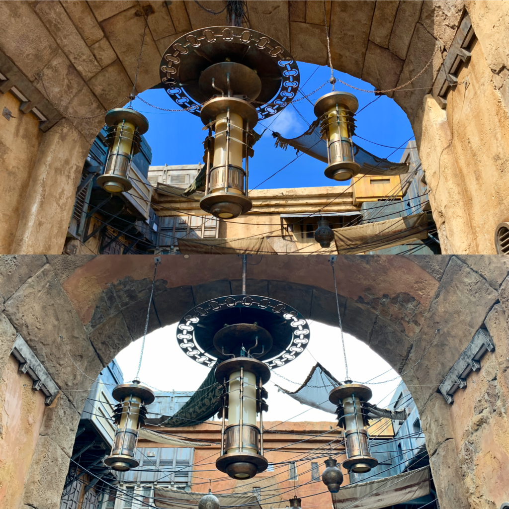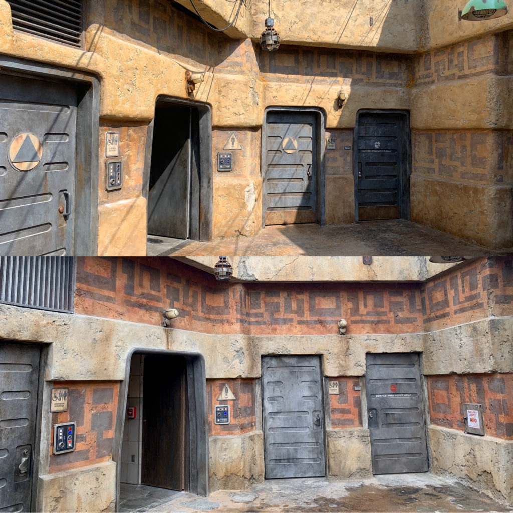 Bright Suns everyone and welcome to a photo comparison of Star Wars: Galaxy’s Edge lands. Now that we are less than a month away from the public opening at Disney's Hollywood Studios in Walt Disney World, Cast Member previews have begun. Not only were we lucky enough to attend but, due to the fact that the land has been open in Disneyland for a few months, we've been able to take all of the Batuu pictures and video we want. Of course, the lands are basically the same on both coasts with Millennium Falcon: Smugglers Run, Oga's Cantina, Savi's Workshop, and many other retailer locations and quick-service locations being very much mirrored. However, the land as a whole has a very different look due to the color palettes differing due to the way the sun hits and affects the lands. Also, as the Disney's Hollywood Studios land is just in its first day of previews, not all the propping is complete, so some things could change before the official opening. That said, overall, the look is mostly complete.