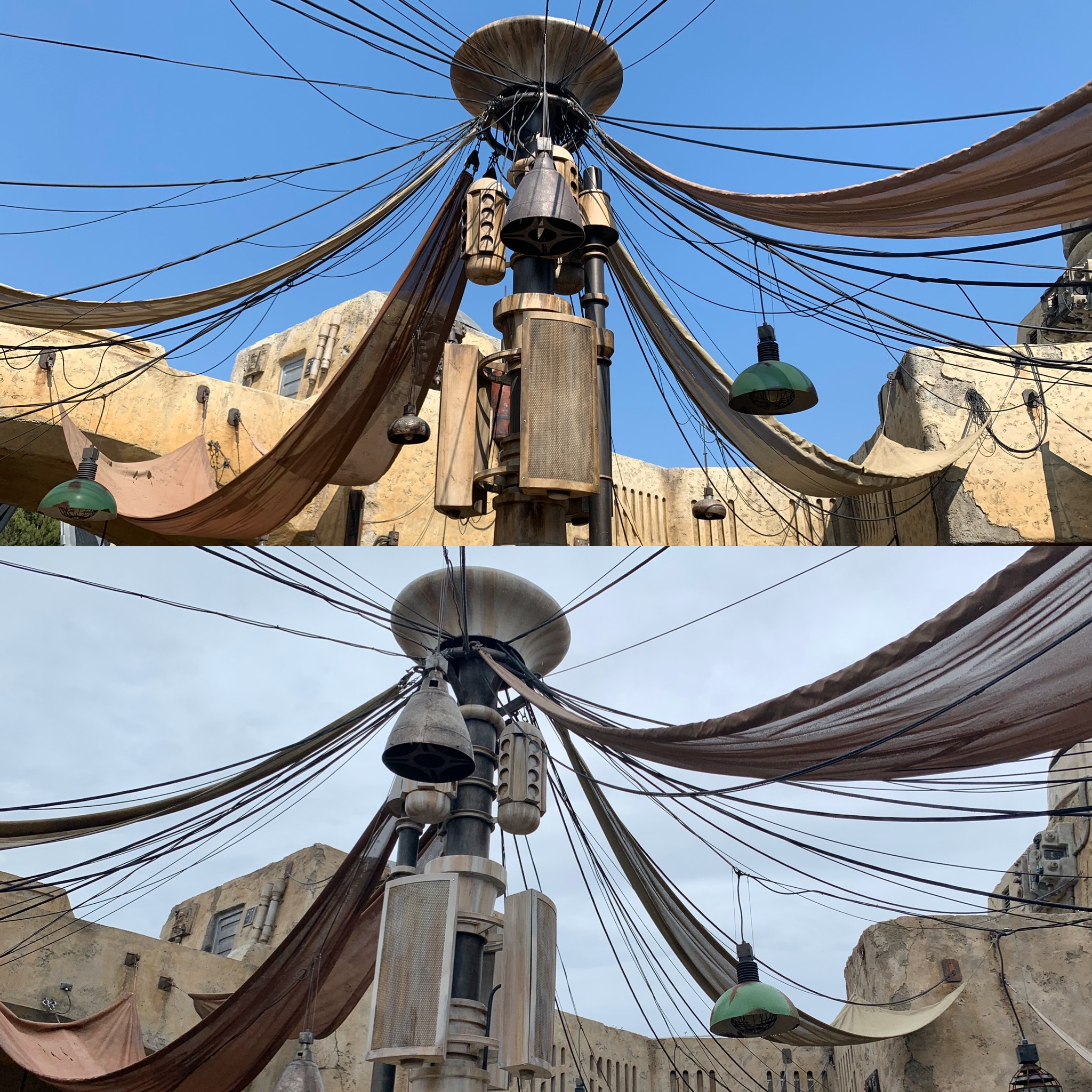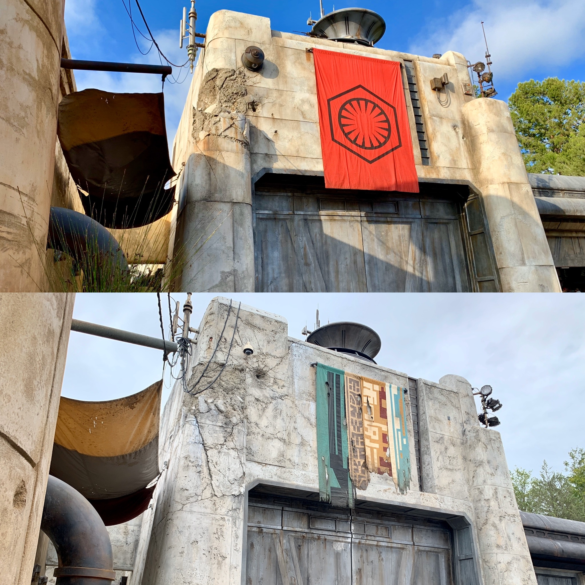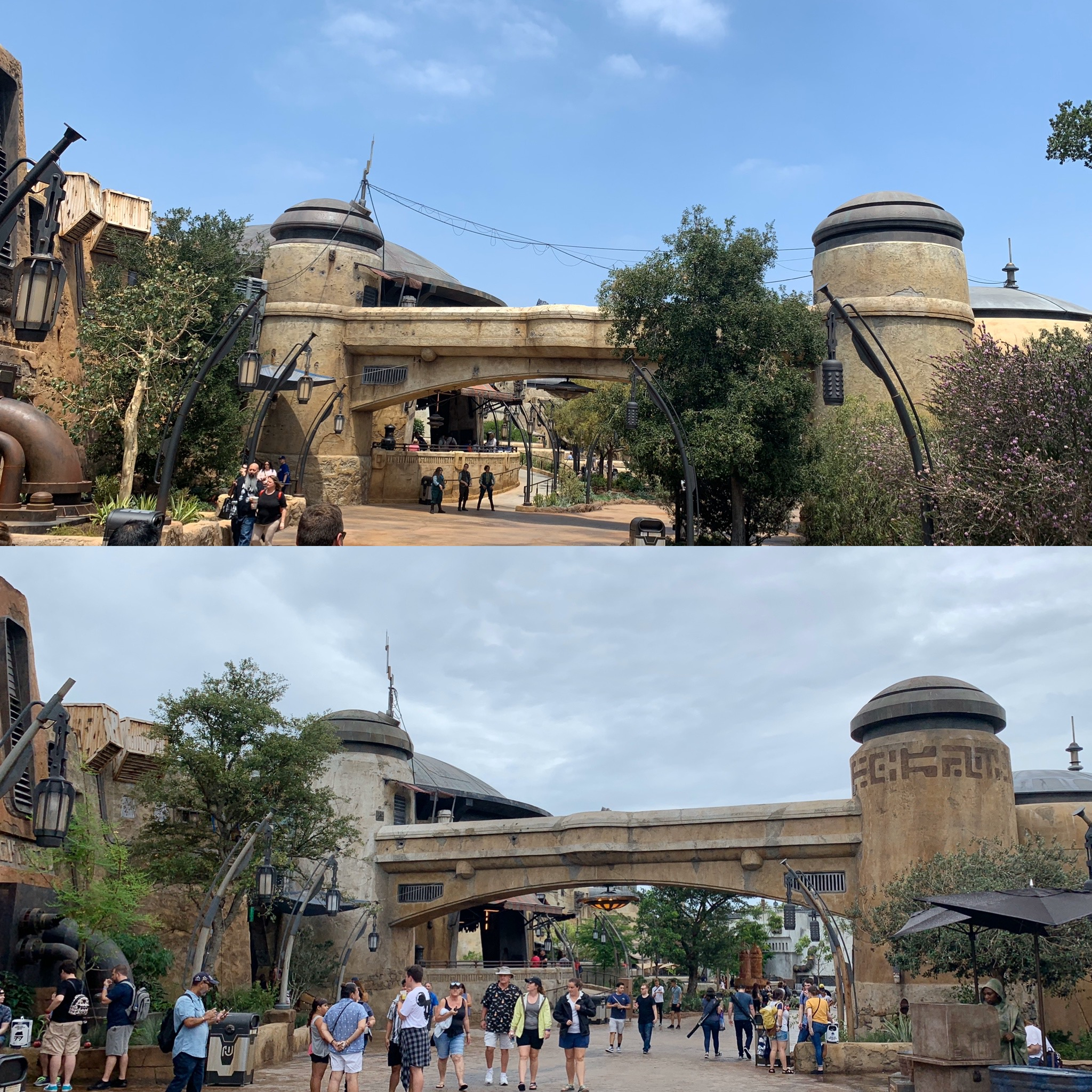 Bright Suns everyone and welcome to a photo comparison of Star Wars: Galaxy’s Edge lands. Now that we are less than a month away from the public opening at Disney's Hollywood Studios in Walt Disney World, Cast Member previews have begun. Not only were we lucky enough to attend but, due to the fact that the land has been open in Disneyland for a few months, we've been able to take all of the Batuu pictures and video we want. Of course, the lands are basically the same on both coasts with Millennium Falcon: Smugglers Run, Oga's Cantina, Savi's Workshop, and many other retailer locations and quick-service locations being very much mirrored. However, the land as a whole has a very different look due to the color palettes differing due to the way the sun hits and affects the lands. Also, as the Disney's Hollywood Studios land is just in its first day of previews, not all the propping is complete, so some things could change before the official opening. That said, overall, the look is mostly complete.