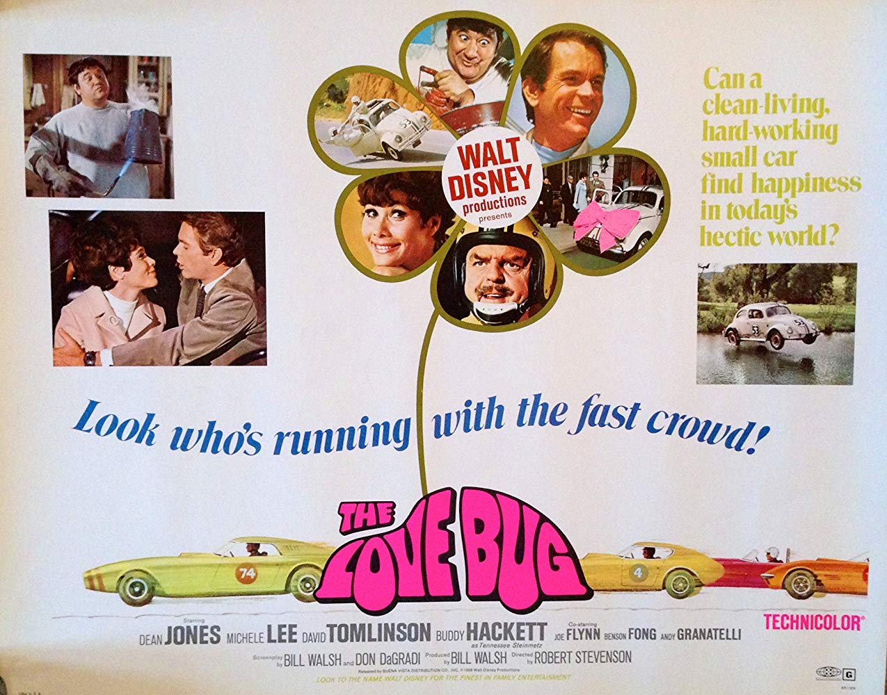 Dean Jones stars as Jim Douglas, a race car driver down on his luck. When his car dies, he buys a new one from a racer/dealer named Thorndyke (David Tomlinson, Mary Poppins) and the only one he can afford is a lackluster looking VW Beetle that turns out to have a mind of its own. Nicknamed Herbie by his mechanic Tennessee (Buddy Hackett, The Little Mermaid), the little car not only changes Jim’s luck on the race track, but also his luck in love with the pretty car salesgirl.