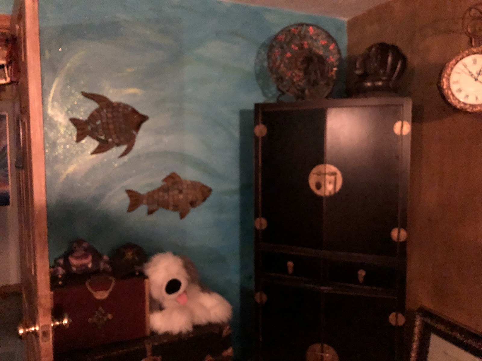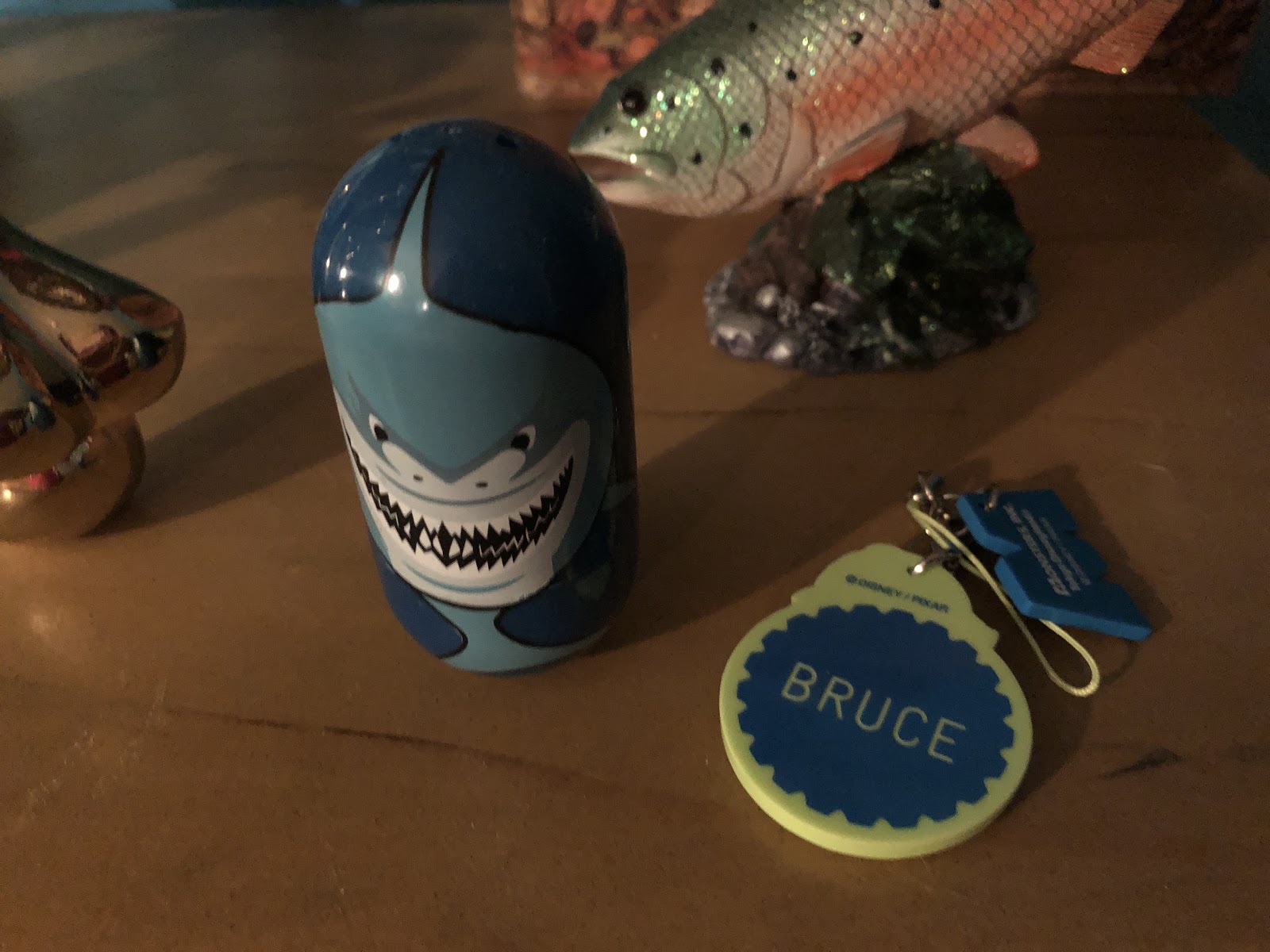My friend Bruce left a weeble style Bruce figure and a Mike Wazowski dangle from Tokyo Disney with his name on it, on the shelf that Darla made and painted. Bruce is now in heaven with Walt so it makes me smile to see it.