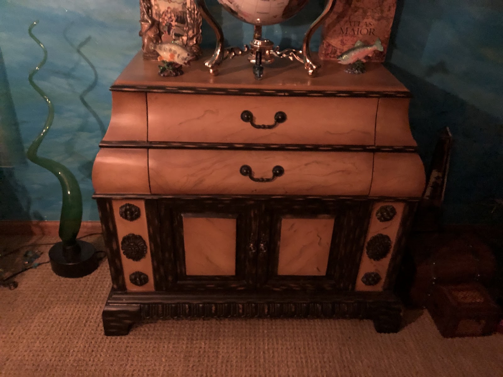 So I started looking at all the furniture stores scratch and dent pieces for some inspiration. And at Big Lots, I found it!!! This beautiful dresser caught my eye and I thought it was something that you find on a Pirate Ship. I had been thinking of doing a more adult Little Mermaid themed room (you Disney geeks get it) and a pirate room would be perfect to showcase my brassy style mermaid pieces. Plus,I loved the Pirates of the Caribbean ride and Captain Jack. This piece was damaged but I knew I could fix it. And for $55, it was the right price. My brother came to my rescue with his truck to take it home and the pirate room began.