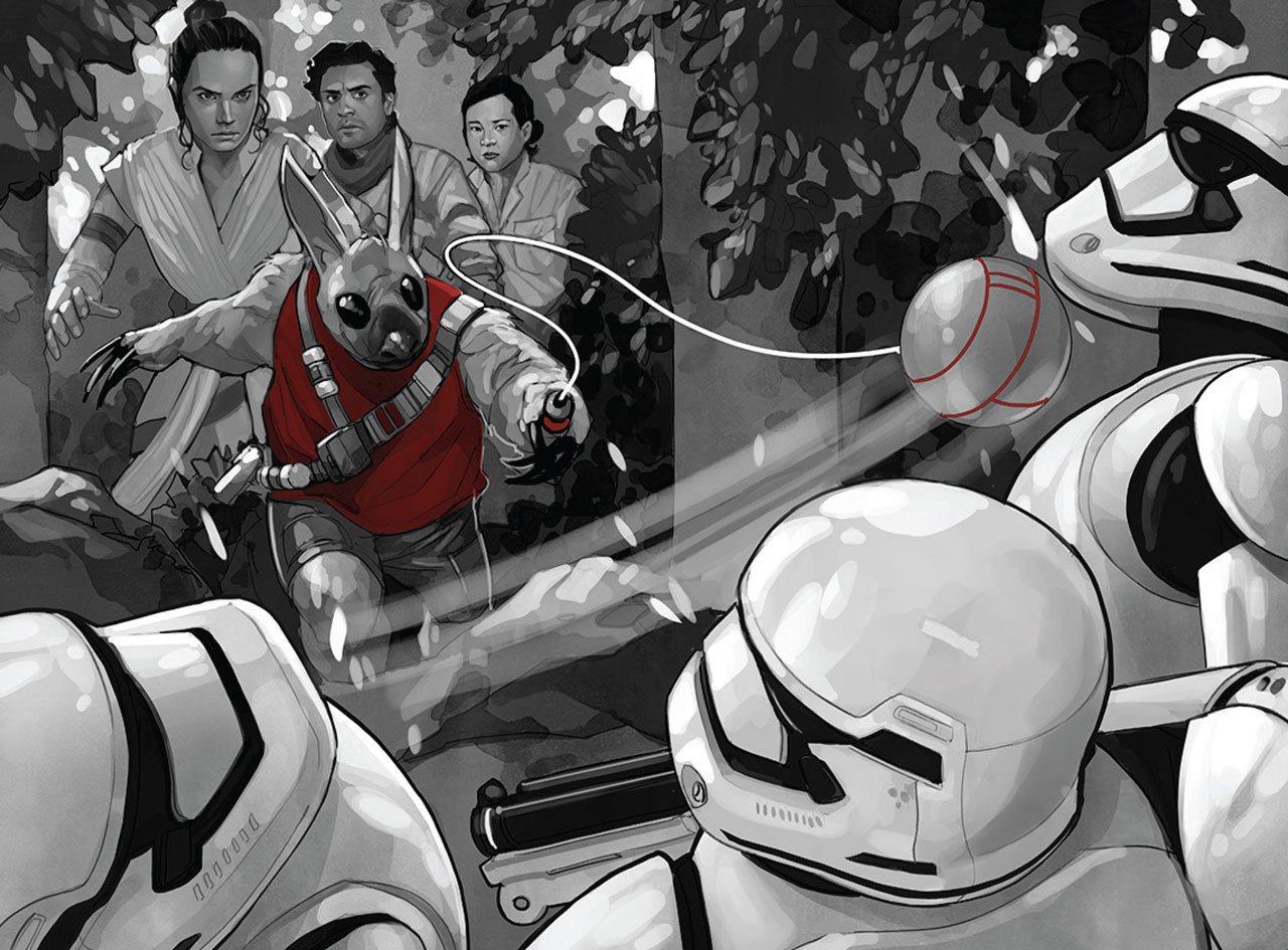 This book also features some funny appearances by the porgs who have made their new home aboard the Millennium Falcon after The Last Jedi, as illustrated in the above evocative artwork by Phil Noto (Star Wars: Lost Stars, Marvel Comics’ Black Widow), which is peppered sparingly throughout the novelette. Star Wars: Spark of the Resistance is a light, fun, probably mostly inconsequential side quest story spotlighting some familiar and popular sequel trilogy characters, and it will likely be best enjoyed by grade school enthusiasts of A Galaxy Far, Far Away.