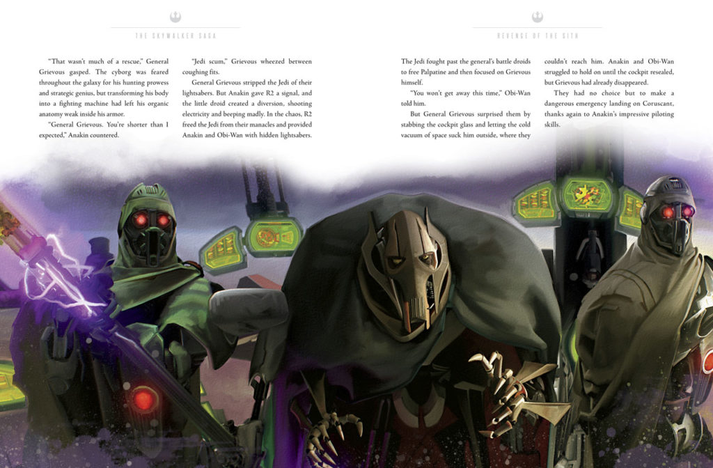 Then, we enter into the Disney-produced sequel generation as The Skywalker Saga covers the events of Star Wars: The Force Awakens and Star Wars: The Last Jedi, following the mysterious scavenger Rey as she joins the Resistance to face off against Anakin’s grandson Ben Solo AKA Kylo Ren and his military force The First Order. Naturally, the book does not include any details from The Rise of Skywalker, as Lucasfilm tends to be fairly protective about the plot of its new releases before they’re released. That said it does feel a little odd and incomplete that this large hardbound volume only includes the story of Episodes I through VIII, and after IX comes out it will certainly become outdated rather quickly. Maybe we’ll see a follow-up edition by Dawson chronicling the full epic.