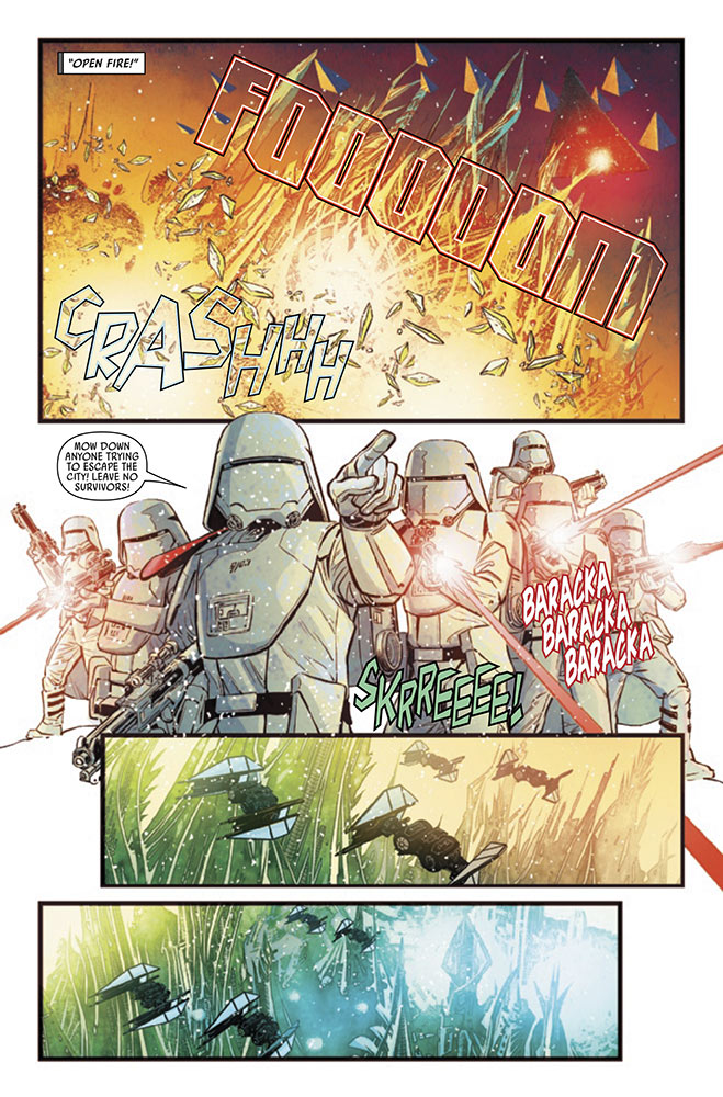 And so Leia, Rose Tico, and Rey take the Millennium Falcon to Mon Cala in the hopes of reassembling old allies. Meanwhile, Finn and Poe Dameron are visiting the Wayward Comet refueling station in search of a cache of weapons the New Republic once confiscated from a band of pirates, which will, as Finn says, “give the Resistance a fighting chance against the First Order.” Along the way they are spotted by the shapeshifting Clawdite Remex Io, who (along with the Kendoh Gang previously featured in Marvel’s Star Wars: Galaxy’s Edge series, which actually takes place after Allegiance) calls in General Hux to claim the bounty on Finn’s head.