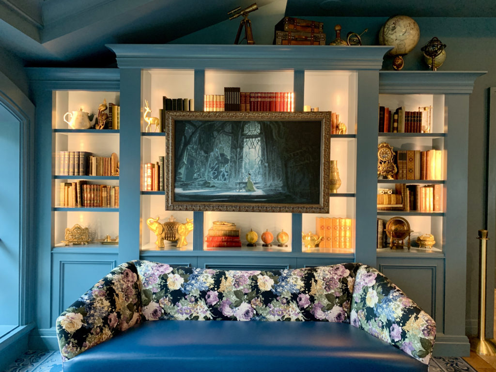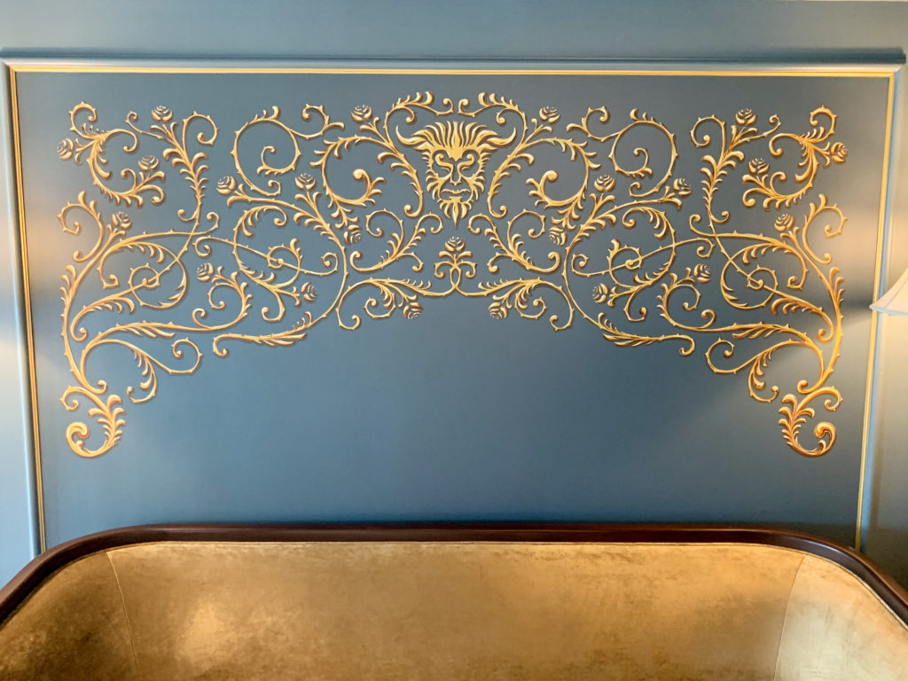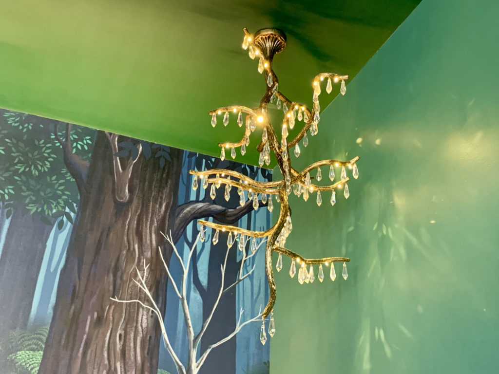 The garden room is inspired by the enchanted forest surrounding the Beast's castle in the film has a hand-painted mural and beautiful light fixtures.