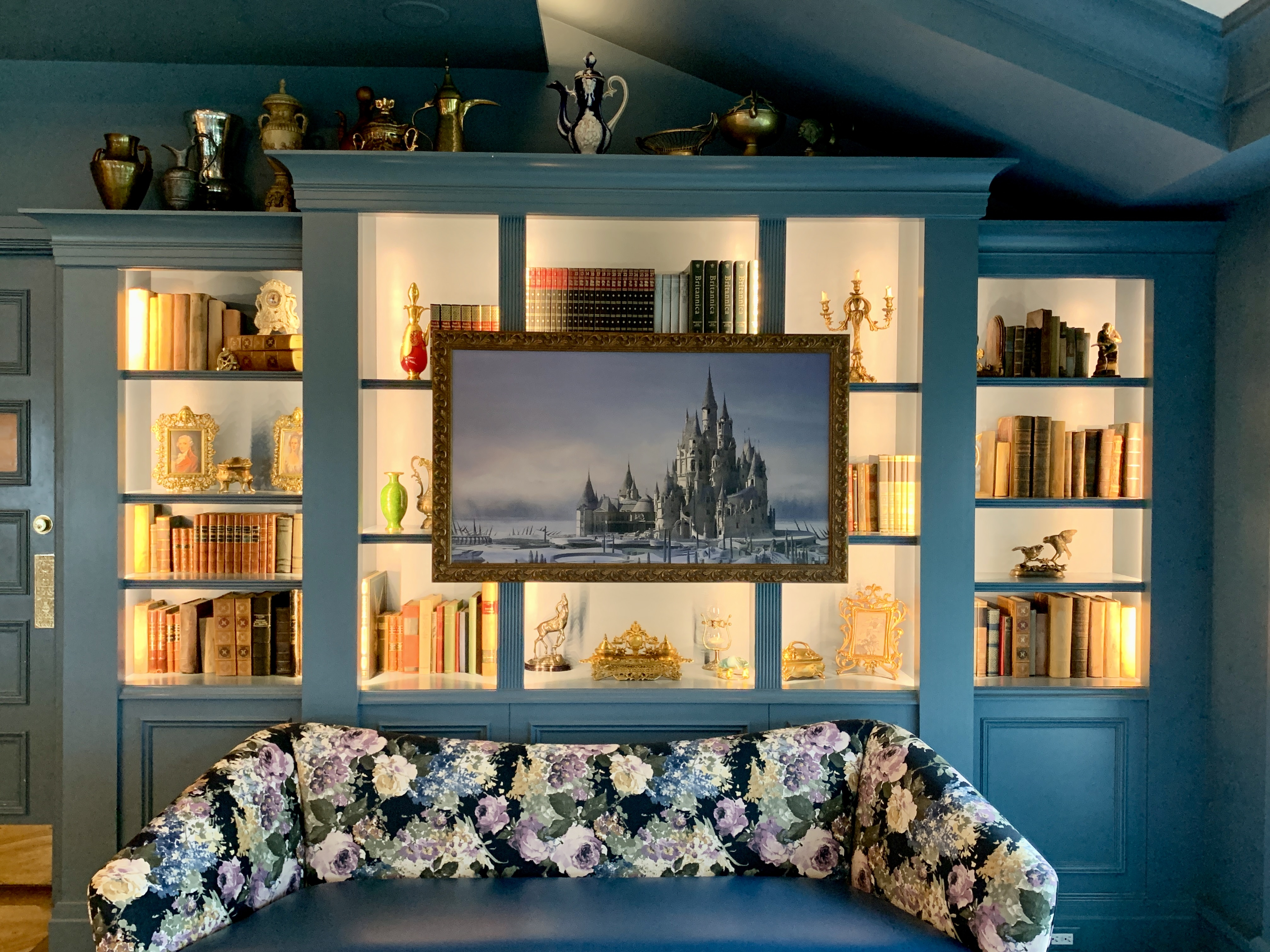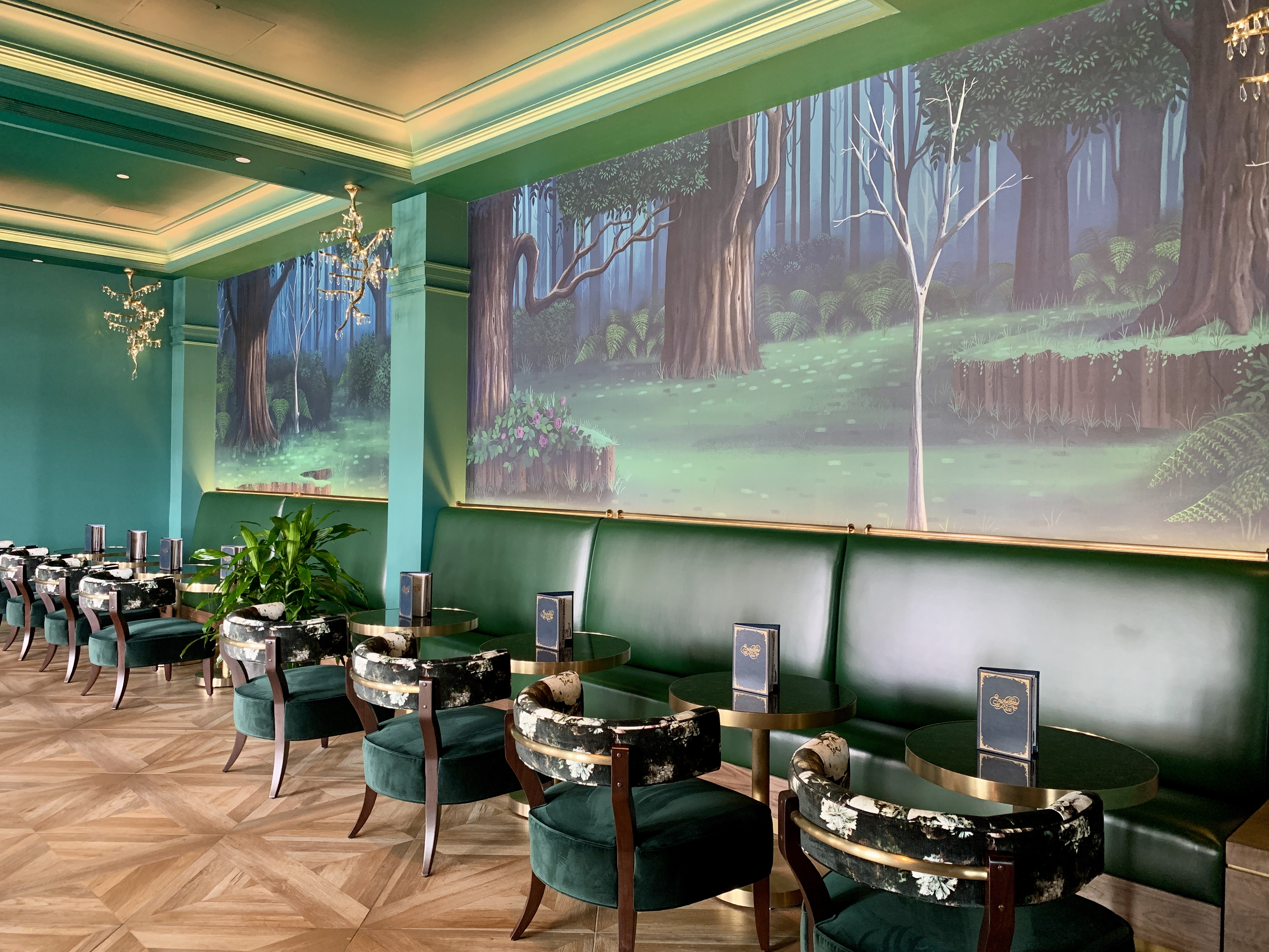 The garden room is inspired by the enchanted forest surrounding the Beast's castle in the film has a hand-painted mural and beautiful light fixtures.
