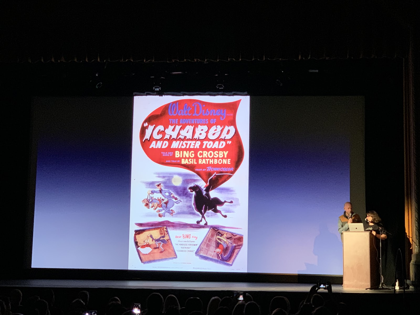 The presentation included the classic 1952 Donald Duck cartoon “Trick or Treat” as well as a special screening of The Legend of Sleepy Hollow with a rarely seen 14-minute animated prologue from the 1956 Disneyland television series, recounting the life of the story's author Washington Irving. Cline also shared two behind the scenes stories about the film. First, there is a piece of reused animation from the fire scene in Bambi when the Headless Horseman hurls the flaming jack-o-lantern across the bridge at Ichabod. Second, Disney animator Andreas Deja apparently used Brom Bones as an inspiration for Gaston when he was creating the character for Beauty and the Beast. Just before the screening, Cline and Iwan also let us listen to a recording of Bing Crosby, the narrator for the film, from one of his radio programs singing the song from the film live.