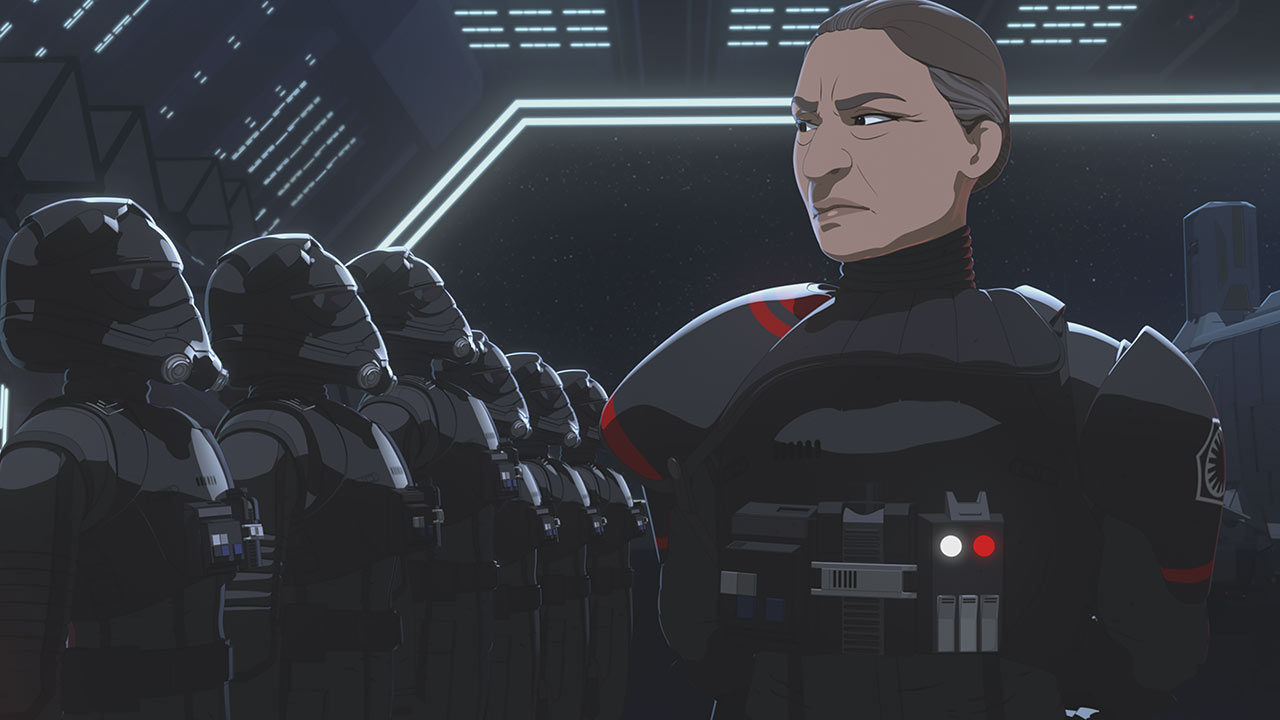 During their TIE Fighter drill, Tam destroys more drones than anyone else and earns the praise of Commander Pyre (Liam McIntyre) until she breaks formation to save Rucklin after his engines fail and he almost crashes into the Star Destroyer. Once she has landed back in the hangar bay, Tam is reprimanded by Galek, who says it’s her duty to complete the mission of destroying the enemy instead of “rescuing lesser pilots.”