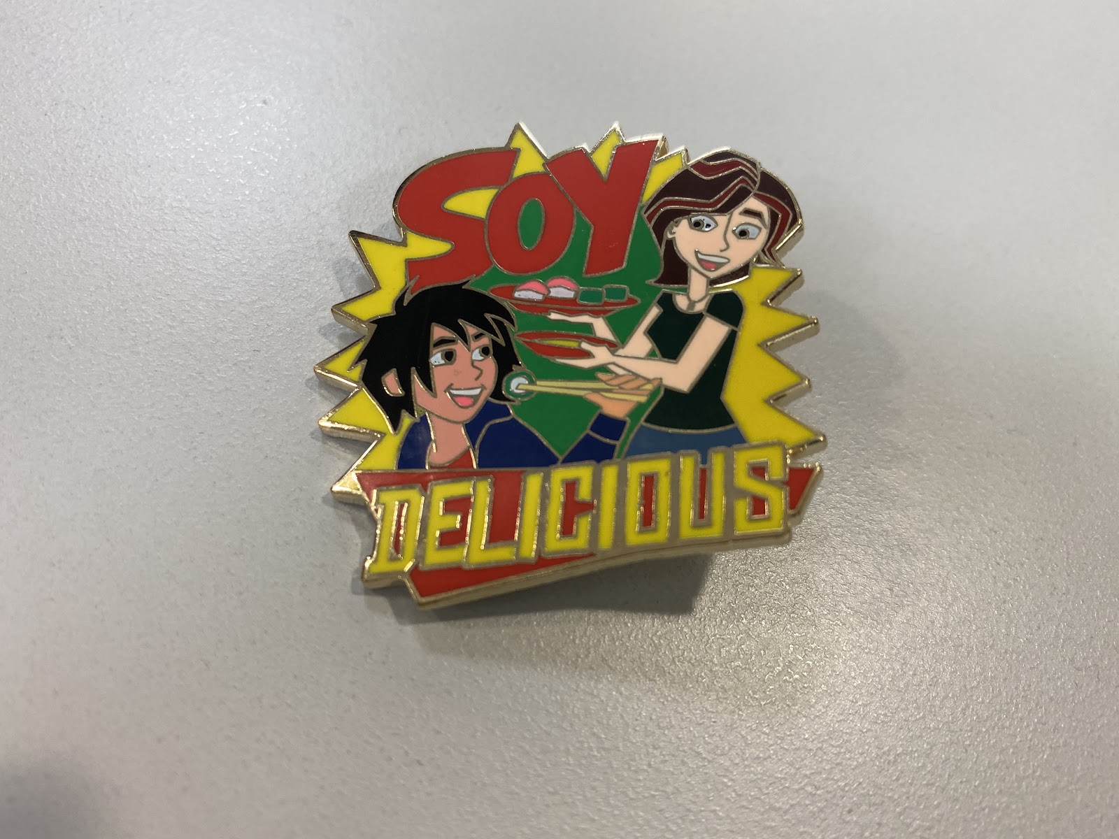 As we were about to depart for our next adventure, our instructors shared that they had one more treat for us. It was our pin of the day with the day’s title, “Soy Delicious.” It featured Hiro and Aunt Cass from Big Hero 6 eating sushi.