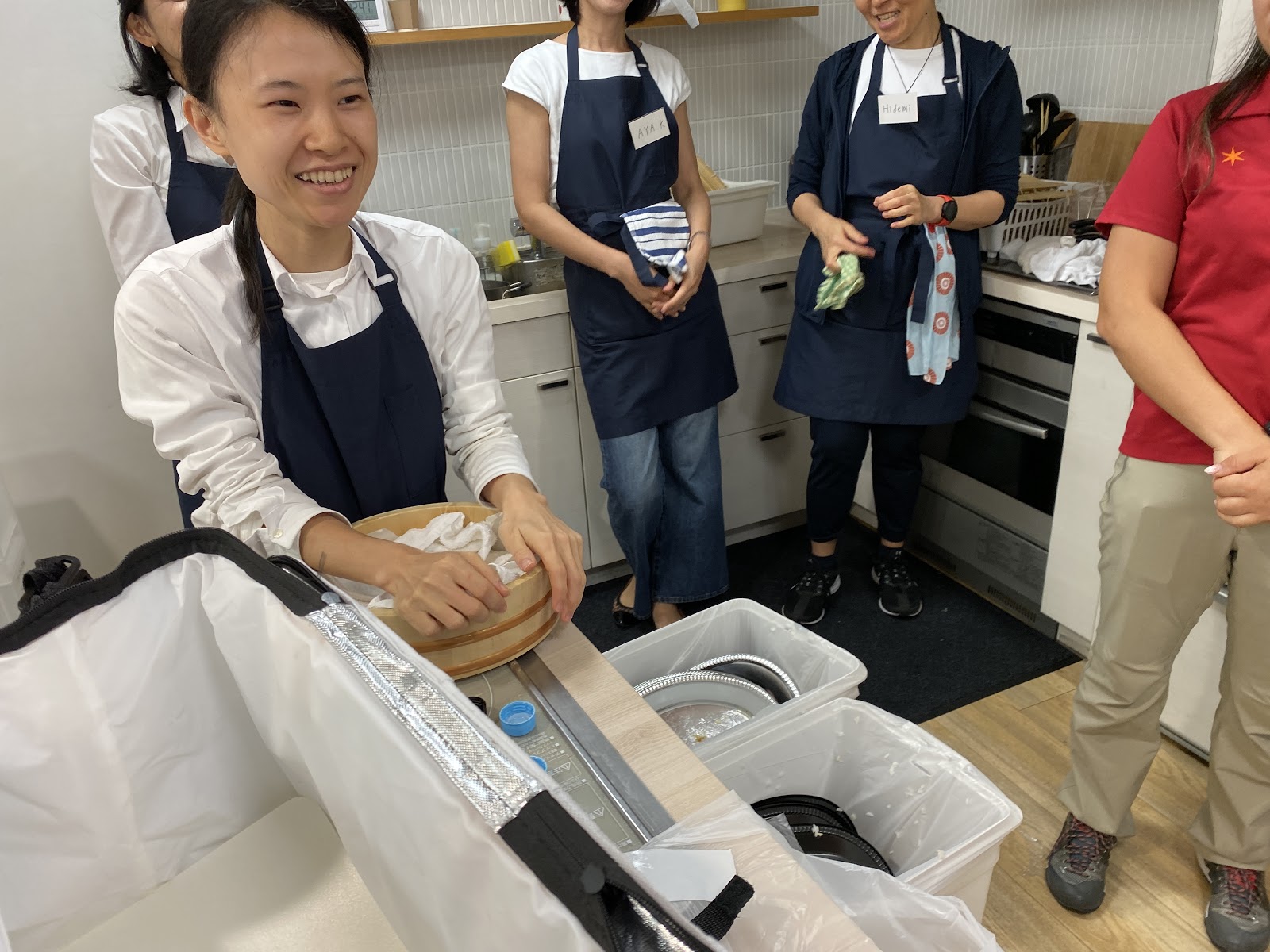 Out next stop was a sushi making experience. We made tamagoyaki (Japanese rolled egg) like we did in Kyoto for the bento box class, but we learned that in Tokyo they add a bonus ingredient, sugar. Next we mixed warm sticky rice with rice vinegar, turning and cutting the rice while someone else fanned it to cool it down to room temperature. Then it was time to learn how to roll sushi, skinny roll style and California roll. As someone who doesn’t like seafood, I was grateful for menu accommodations. I could’ve gone all vegetarian, but I decided to try imitation crab and I didn’t hate it. When we were done, we got to eat our sushi creations for lunch.